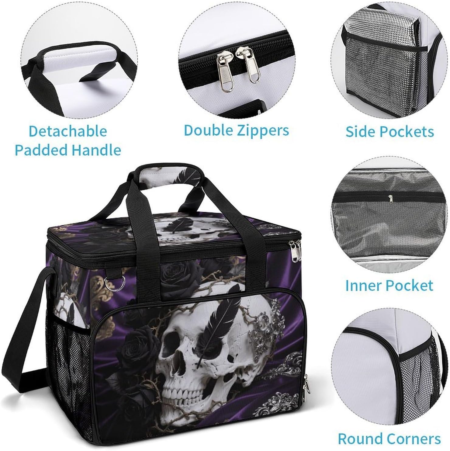 Take Your Meals Anywhere with Black Floral Skull Grocery BagsFood Container Carrier Oxford Fabric Picnic Bag Heat Retaining Food Bag Camping Cooler BBQ Accessories Cute Picnic Bag with Pockets Insulated Food Bag for Work Insulated Lunch Tote Bag Camping BagTemperature Control That WorksThe upgraded aluminum foil lining creates an effective thermal barrier. Your drinks stay refreshingly cold, and your hot dishes maintain their warmth for hours. No more lukewarm meals during outdoor outings.Thoughtful Storage DesignTwo side mesh pockets - Perfect for water bottles or umbrellasFront zippered pocket - Keeps keys, phone, or condiments organizedInternal mesh pocket - Stores utensils, napkins, and small essentialsMain compartment - Spacious enough for food containers and snacksBuilt for Daily AdventuresConstructed from high-density oxford fabric with reinforced stitching at stress points. The double zippers are sturdy and smooth-operating. Reinforced handles let you carry heavy loads with confidence.Carry Your WayHandles for quick grabbingStands upright for easy packing and accessPerfect For:Picnics in the parkBeach days and pool partiesCamping and hiking tripsOutdoor concerts and festivalsDaily work lunchesGym and fitness classesRoad trips and travelGrocery shoppingSpecifications:Dimensions: 15.4 x 11.8 x 11.8 inchesMaterial: High-density Oxford fabricLining: Aluminum foil (insulated)Closure: Sturdy double zippersPockets: 2 side mesh, 1 front zipper, 1 internal meshCare: Hand wash or machine wash, do not bleachNote: Food containers and utensils shown in images are not included.