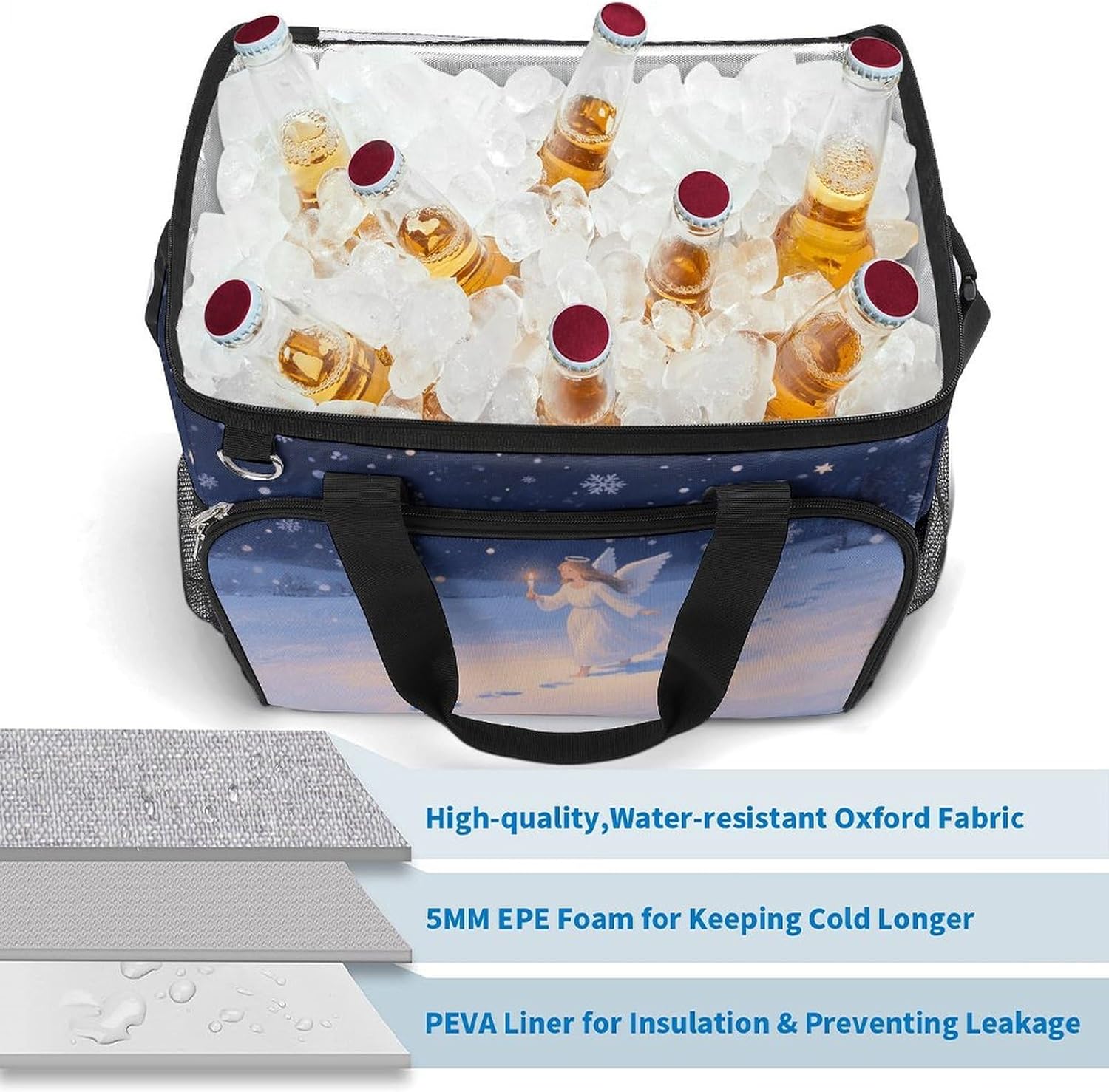 Take Your Meals Anywhere with Angel Grocery BagsFood Container Carrier Oxford Fabric Picnic Bag Heat Retaining Food Bag Camping Cooler BBQ Accessories Cute Picnic Bag with Pockets Insulated Food Bag for Work Insulated Lunch Tote Bag Camping BagTemperature Control That WorksThe upgraded aluminum foil lining creates an effective thermal barrier. Your drinks stay refreshingly cold, and your hot dishes maintain their warmth for hours. No more lukewarm meals during outdoor outings.Thoughtful Storage DesignTwo side mesh pockets - Perfect for water bottles or umbrellasFront zippered pocket - Keeps keys, phone, or condiments organizedInternal mesh pocket - Stores utensils, napkins, and small essentialsMain compartment - Spacious enough for food containers and snacksBuilt for Daily AdventuresConstructed from high-density oxford fabric with reinforced stitching at stress points. The double zippers are sturdy and smooth-operating. Reinforced handles let you carry heavy loads with confidence.Carry Your WayHandles for quick grabbingStands upright for easy packing and accessPerfect For:Picnics in the parkBeach days and pool partiesCamping and hiking tripsOutdoor concerts and festivalsDaily work lunchesGym and fitness classesRoad trips and travelGrocery shoppingSpecifications:Dimensions: 15.4 x 11.8 x 11.8 inchesMaterial: High-density Oxford fabricLining: Aluminum foil (insulated)Closure: Sturdy double zippersPockets: 2 side mesh, 1 front zipper, 1 internal meshCare: Hand wash or machine wash, do not bleachNote: Food containers and utensils shown in images are not included.