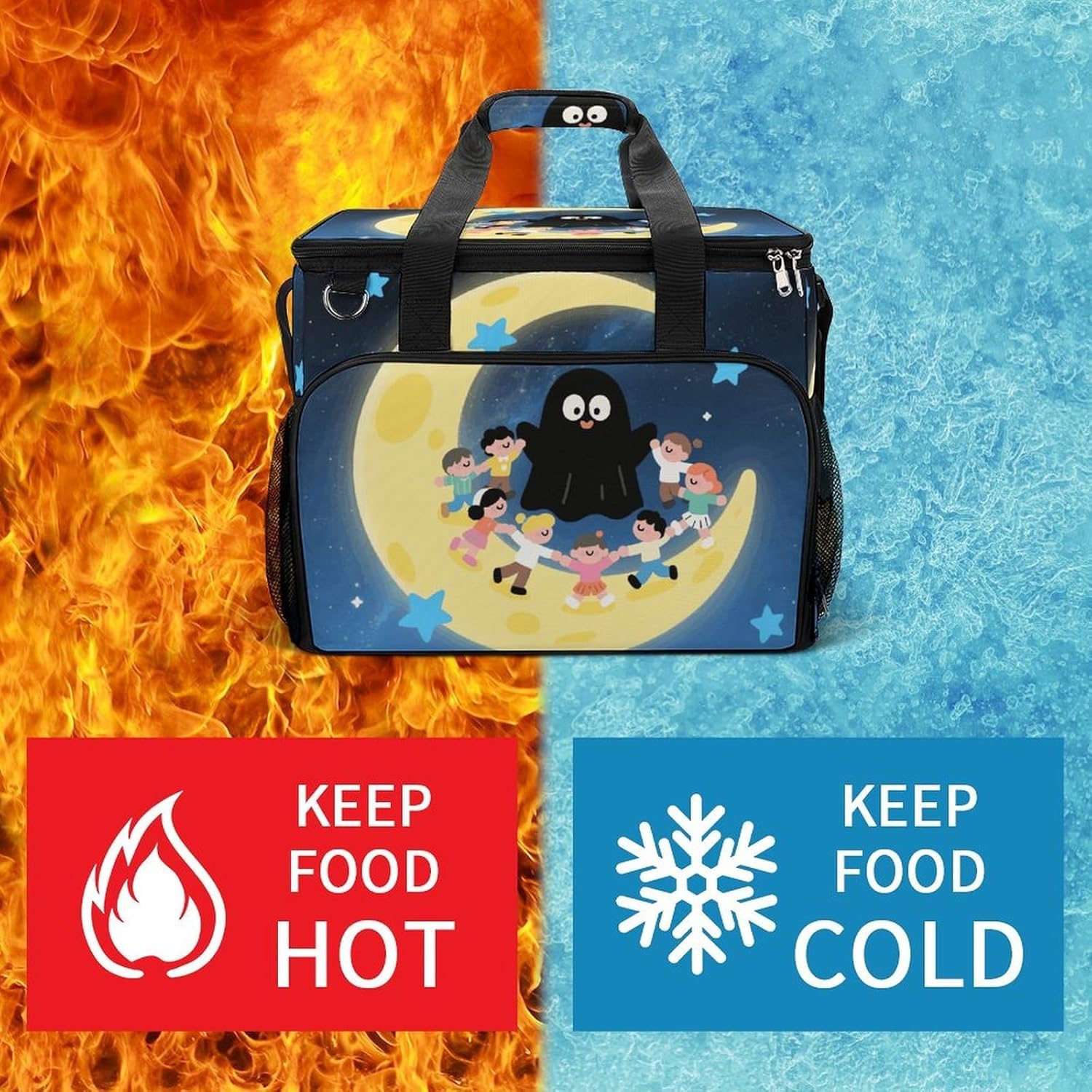 Take Your Meals Anywhere with Black Cute Ghost Grocery BagsFood Container Carrier Oxford Fabric Picnic Bag Heat Retaining Food Bag Camping Cooler BBQ Accessories Cute Picnic Bag with Pockets Insulated Food Bag for Work Insulated Lunch Tote Bag Camping BagTemperature Control That WorksThe upgraded aluminum foil lining creates an effective thermal barrier. Your drinks stay refreshingly cold, and your hot dishes maintain their warmth for hours. No more lukewarm meals during outdoor outings.Thoughtful Storage DesignTwo side mesh pockets - Perfect for water bottles or umbrellasFront zippered pocket - Keeps keys, phone, or condiments organizedInternal mesh pocket - Stores utensils, napkins, and small essentialsMain compartment - Spacious enough for food containers and snacksBuilt for Daily AdventuresConstructed from high-density oxford fabric with reinforced stitching at stress points. The double zippers are sturdy and smooth-operating. Reinforced handles let you carry heavy loads with confidence.Carry Your WayHandles for quick grabbingStands upright for easy packing and accessPerfect For:Picnics in the parkBeach days and pool partiesCamping and hiking tripsOutdoor concerts and festivalsDaily work lunchesGym and fitness classesRoad trips and travelGrocery shoppingSpecifications:Dimensions: 15.4 x 11.8 x 11.8 inchesMaterial: High-density Oxford fabricLining: Aluminum foil (insulated)Closure: Sturdy double zippersPockets: 2 side mesh, 1 front zipper, 1 internal meshCare: Hand wash or machine wash, do not bleachNote: Food containers and utensils shown in images are not included.