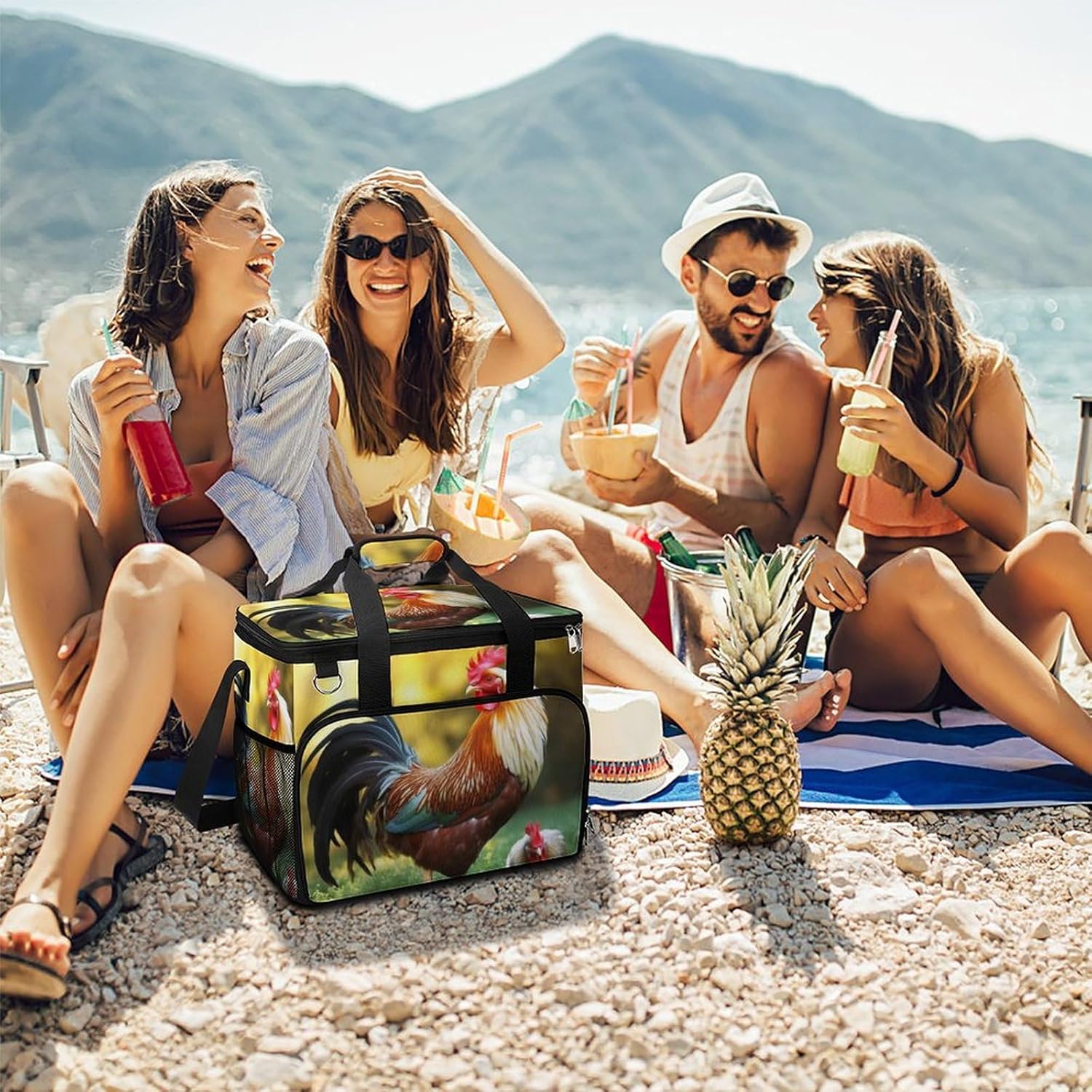 Take Your Meals Anywhere with Beautiful Rooster Hen Grocery BagsFood Container Carrier Oxford Fabric Picnic Bag Heat Retaining Food Bag Camping Cooler BBQ Accessories Cute Picnic Bag with Pockets Insulated Food Bag for Work Insulated Lunch Tote Bag Camping BagTemperature Control That WorksThe upgraded aluminum foil lining creates an effective thermal barrier. Your drinks stay refreshingly cold, and your hot dishes maintain their warmth for hours. No more lukewarm meals during outdoor outings.Thoughtful Storage DesignTwo side mesh pockets - Perfect for water bottles or umbrellasFront zippered pocket - Keeps keys, phone, or condiments organizedInternal mesh pocket - Stores utensils, napkins, and small essentialsMain compartment - Spacious enough for food containers and snacksBuilt for Daily AdventuresConstructed from high-density oxford fabric with reinforced stitching at stress points. The double zippers are sturdy and smooth-operating. Reinforced handles let you carry heavy loads with confidence.Carry Your WayHandles for quick grabbingStands upright for easy packing and accessPerfect For:Picnics in the parkBeach days and pool partiesCamping and hiking tripsOutdoor concerts and festivalsDaily work lunchesGym and fitness classesRoad trips and travelGrocery shoppingSpecifications:Dimensions: 15.4 x 11.8 x 11.8 inchesMaterial: High-density Oxford fabricLining: Aluminum foil (insulated)Closure: Sturdy double zippersPockets: 2 side mesh, 1 front zipper, 1 internal meshCare: Hand wash or machine wash, do not bleachNote: Food containers and utensils shown in images are not included.