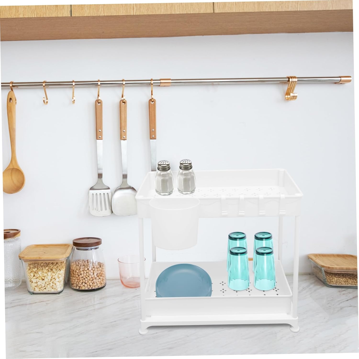 Package Include 1 x set of kitchen organizer Characteristics - Size: 40.00X36.00X23.00cm/15.72X14.15X9.04in under kitchen sink organizers and storage -Material:PP multipurpose sink rack - Color: White sink storage rack holder - This kitchen storage rack uses a guardrail prevent tableware from accidentally falling, use with confidence telescopic sink holder. - It is designed to be pulled out basket, which is more convenient to use than other normal storage organizers telescopic sink storage rack. - Hollow design, ventilation and drainage. Suitable for kitchen, bathroom, laundry room and other places. under sink drawers storage rack - PP material, strong and . Large load-bearing capacity, this kitchen storage rack can hold heavy items. under sink shelves - Layered design of this 2 tier kitchen storage rack brings the larger capacity, the material makes it strong and sink storage rack expandable.Goods Descriptionunder kitchen sink organizers and storage Enough capacity to store many seasoning bottles and kitchen supplies.under desk organizers and storage This kitchen storage rack is a helper for kitchen.sink storage rack expandable Do you want to have a kitchen storage rack to store your seasoning bottles and other items? Then, our storage rack is carefully prepared for you