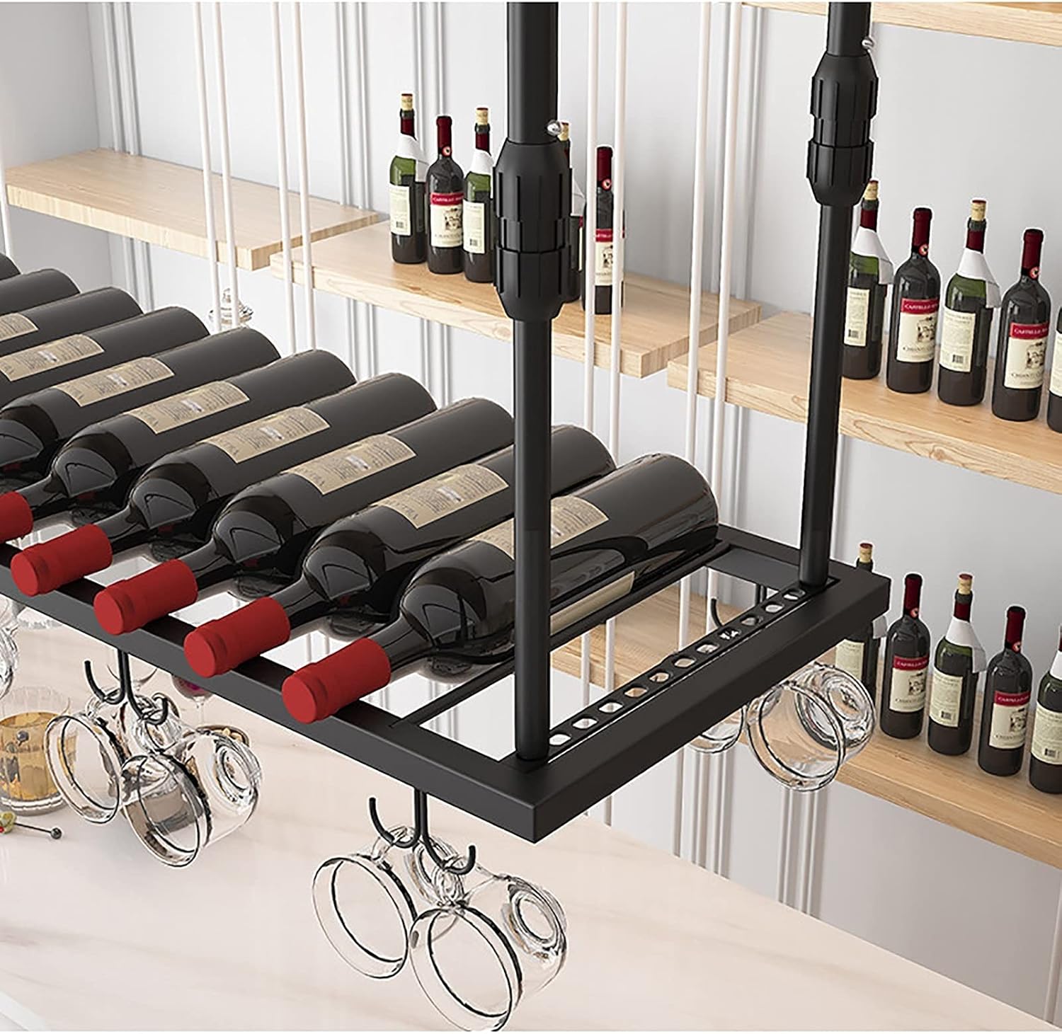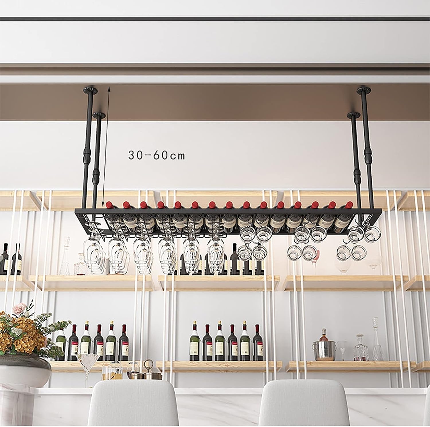 ◣Specifications: Name: Wine Racks/Hanging Wine Glass Rack/Wine Bottle Holder Material: Iron Color: Black Size: 60x30cm, 80x30cm, 100x30cm, 120x30cm Width: 30cm, Height: 30-60cm(adjustment) A