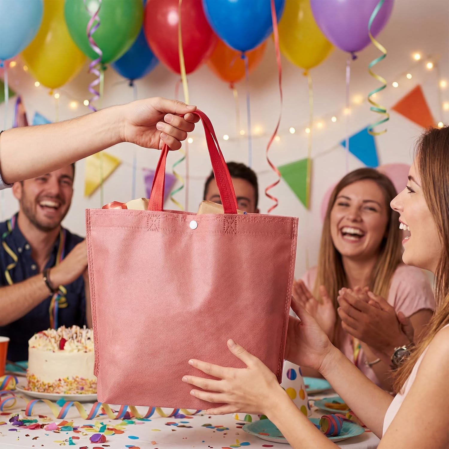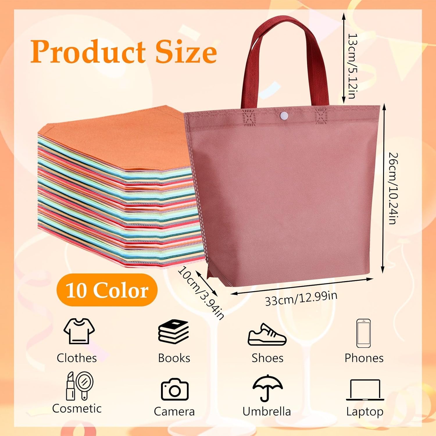 Features: You can find many practical ways to use these reusable bags, such as for carrying groceries, clothes, toys, vegetables, and more. These multi functional non woven tote bags are ideal for birthday parties, gatherings, shopping, supermarket shopping, and weddings. You can also get creative and decorate these shopping bags with DIY paintings, stickers, and decorations. Specifications: Material: non woven Color: multicolor Size: about 13 x 10 inches Package includes: 150 x Reusable tote bag Notes: Manual measurement, please allow slight errors on size. The color may exist a slight difference due to different screen displays