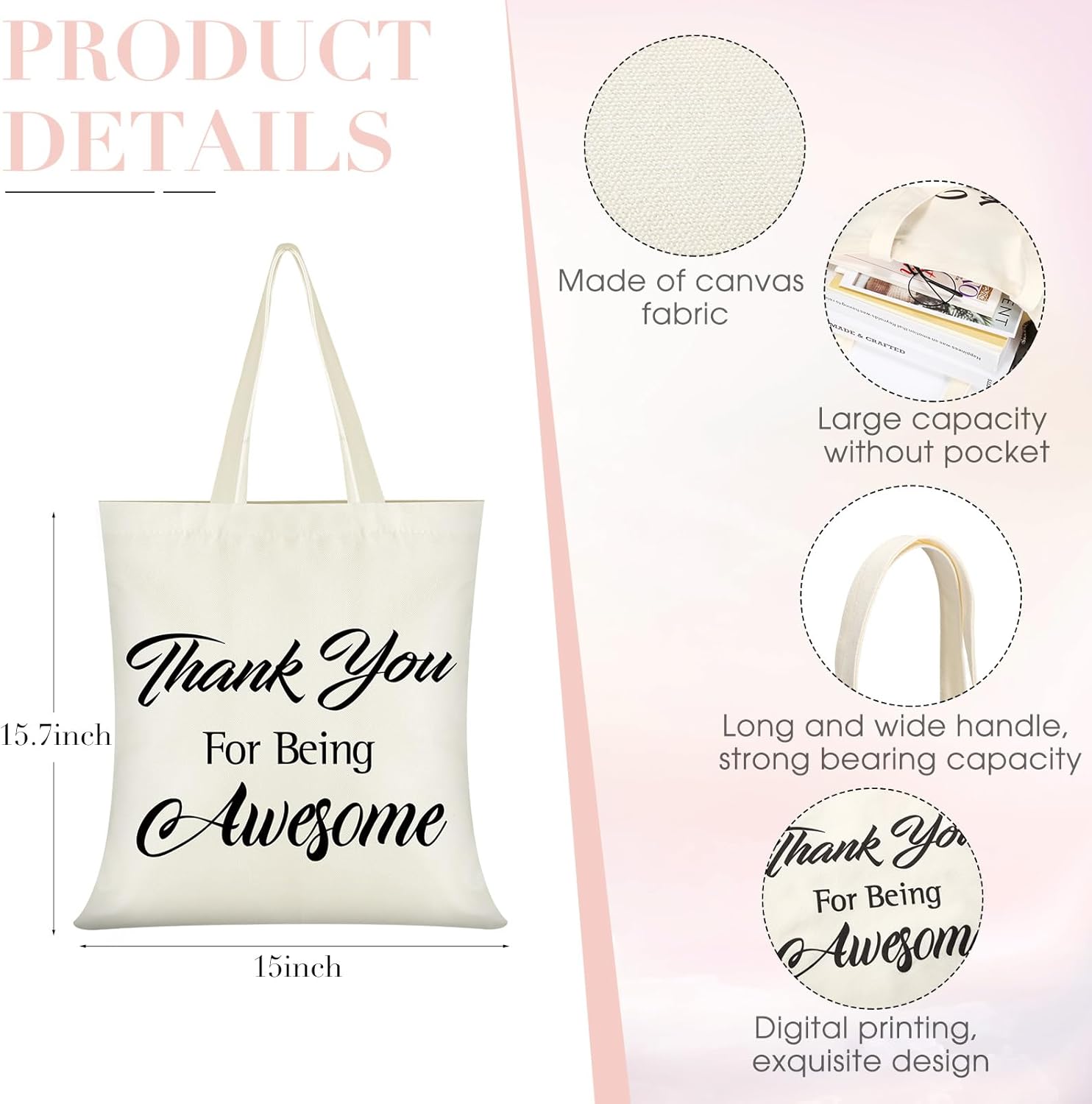 Features: The canvas bags are well crafted with good trimming, stitching and dyeing processes, can stay in the original state as time goes by, not deforming or fraying in a short time. These appreciation reusable shopping bags make for a meaningful and heartfelt gift. Whether it's for a teacher, coworker, or friend, the words on the bags convey a heartfelt message of gratitude and can brighten someone's day. Specifications: Material: canvas Size: about 15 x 15.7 inches/ 38 x 40 cm Package includes: 12 x Appreciation tote bags Warm notes: Manual measurement, please allow slight errors on size. The color may exist a slight difference due to different screen displays