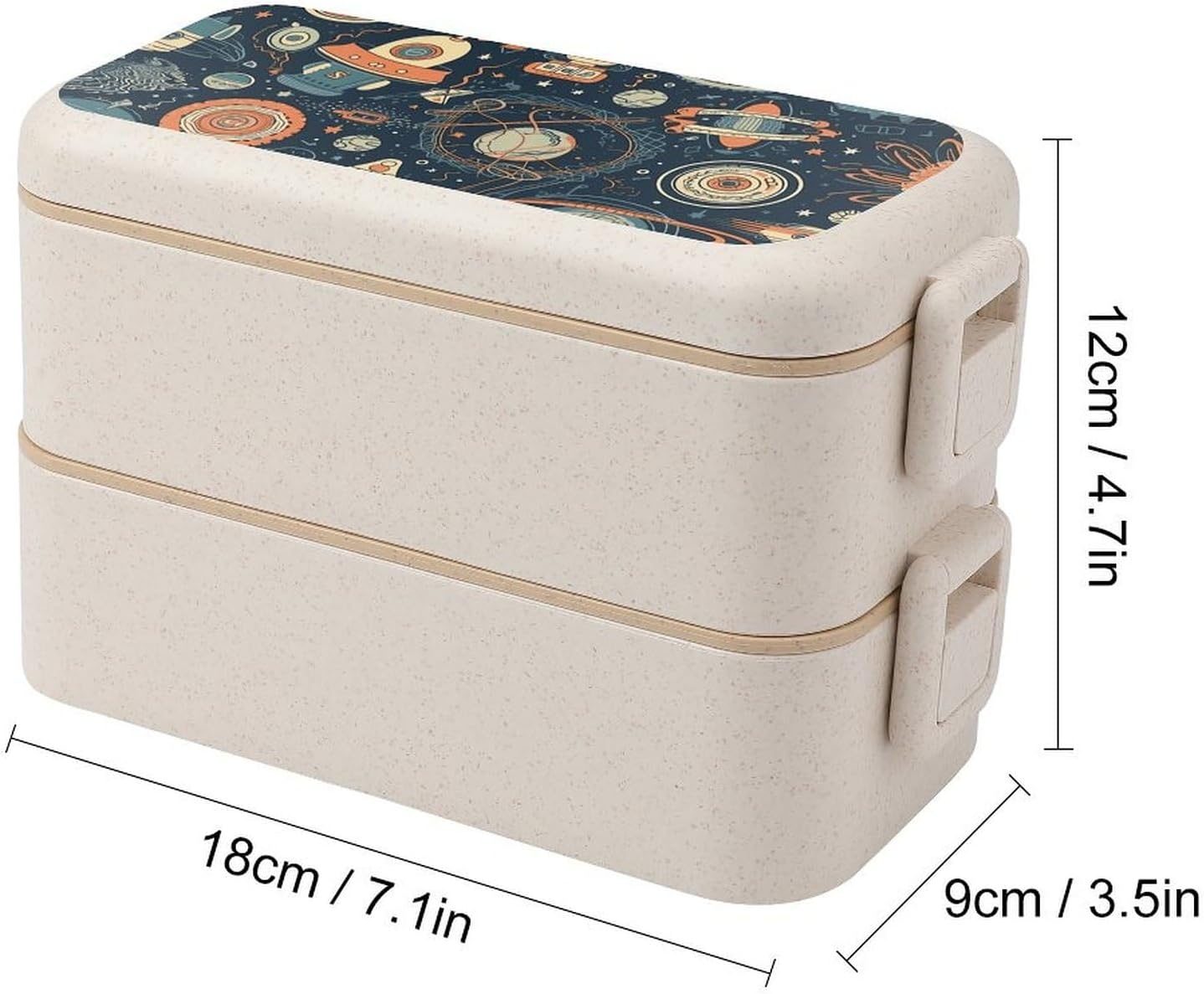 Fruit lunch box The food container is made of selected wheat fiber material,which will not emit other odors due to high temperature.It is a good helper for your daily life.The Space Theme Pattern printed food container adopts a partition design,which can separate different types of food,maintain the original flavor of the food,and plan your meal time reasonably.Integrated lunch box Small size and light texture,it will not feel bulky when put in a handbag or backpack during commuting.Portable lunch box The sealed design can reduce the possibility of accidental food spillage and odor escape,providing convenience for your dining.Travel snack box In addition to accommodating staple foods and side dishes,the large capacity can also be used to place other foods such as fruits and vegetables.Bento box set Washable and reusable.