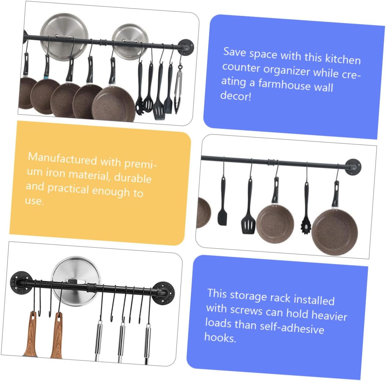 Package List 2 x rods 2 1 x connector 2 x bases 8 x screws 8 x expansion tubes 6 x hooks Features -Product Info:Pot lid stand - Material: Iron. - Color: Black. - Size: 60.00X13.00X5.00cm/23.58X5.11X1.97 inch. - Use it as kitchen organization unit for cooking utensils, as a bathroom organizer to hangs your towels, or in your entryway for hanging coats, bags and keys. Also, it can be a perfect rack for hanging your medals to the wall hooks wall-mounted utensil holder. - Hangs your kitchen accessories, measuring cups, silicone spatulas, cookware set, coffee mugs and more to the hooks that easily slide. Pot Rack with Hooks - Great for storing and organizing pots, pans, kitchens utensils and keeping all within hands reach pot hanger. - Fine workmanship and creative appearance its popularity and practicality pot hanger wall mounted. - This kitchen organization and storage unit will let with your supplies, not around them. Mount it under your kitchen cabinet or above the wall on your coffee machine to organize your kitchen with ease kitchen pot rack.Goods Informationkitchen wall rack This is a pot rack.hanging rack for kitchen utensils Installed with screws, this storage rack can hold heavier items, such as frying pot.hanging pot rack Designed with hooks, this storage hooks can be used to spatulas, pots, pot lids, washing cloths, etc.Pot Rack with Hooks It is made of premium iron material, for use