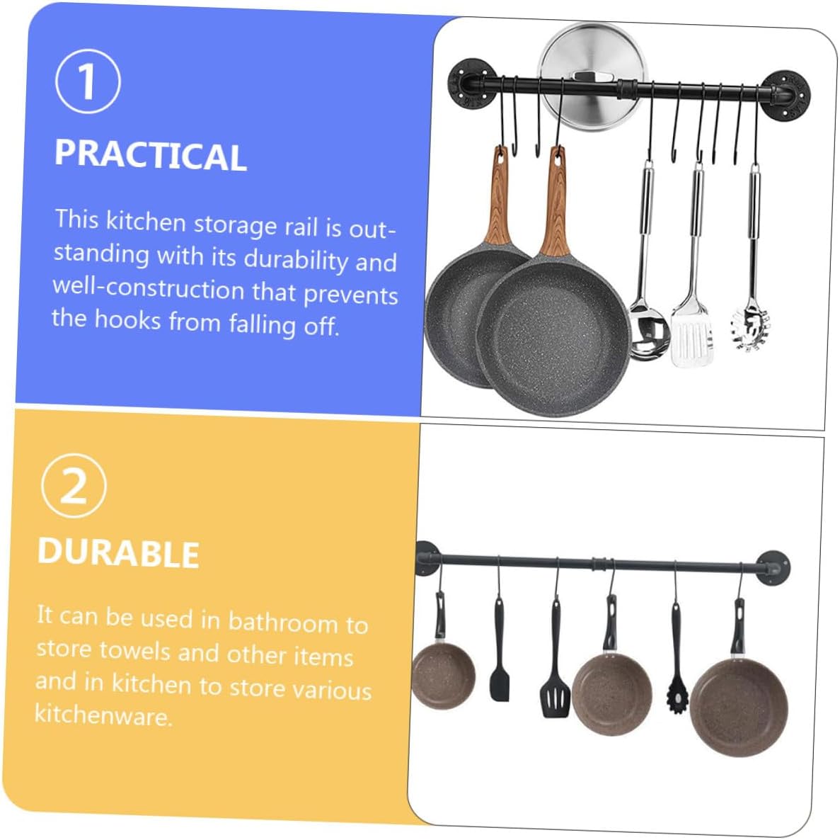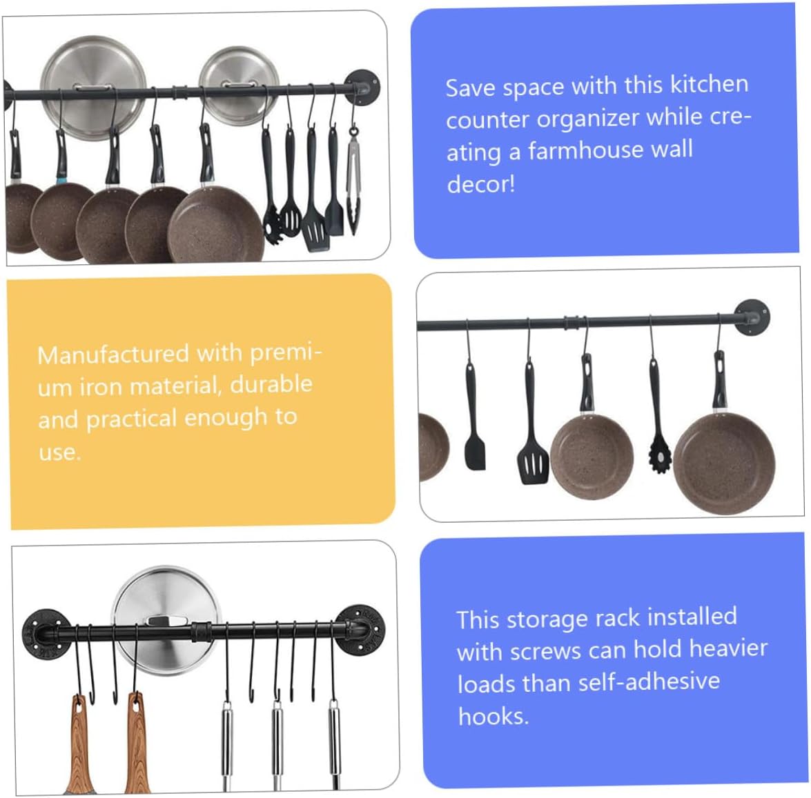 Package List 2 x rods 2 1 x connector 2 x bases 8 x screws 8 x expansion tubes 6 x hooks Features -Product Info:Pot lid stand - Size: 60.00X13.00X5.00cm/23.58X5.11X1.97 inch. - Color: Black. - Material: Iron. - Keep your utensils where you can easily reach and cook like a professional chef pot storage rack. - It can not only be hung in the kitchen as a pot and pans organizer and a towel rack in the bathroom.It can also be installed on the balcony as a plant shelf with hanging bar pot racks. - Hooks that are nailed into the wall are more practical and have greater bearing capacity than self-adhesive ones pot hanger. - Fit for frying pan, camping cookie, skillet, cooking utensils, farmhouse pots and pans, etc kitchen utensil rack. - and fine workmanship make this storage rack and can be used for a long time.Goods Informationhanging pot rack The storage rack with hooks can store various items, such pot, pot lid, spatula, washing cloths and etc.wall mounted pan rack Suitable for kitchen, bathroom, bedroom and other places you need.kitchen utensil hanging rack This is a storage rack, which is made of iron , and can be used for a long time
