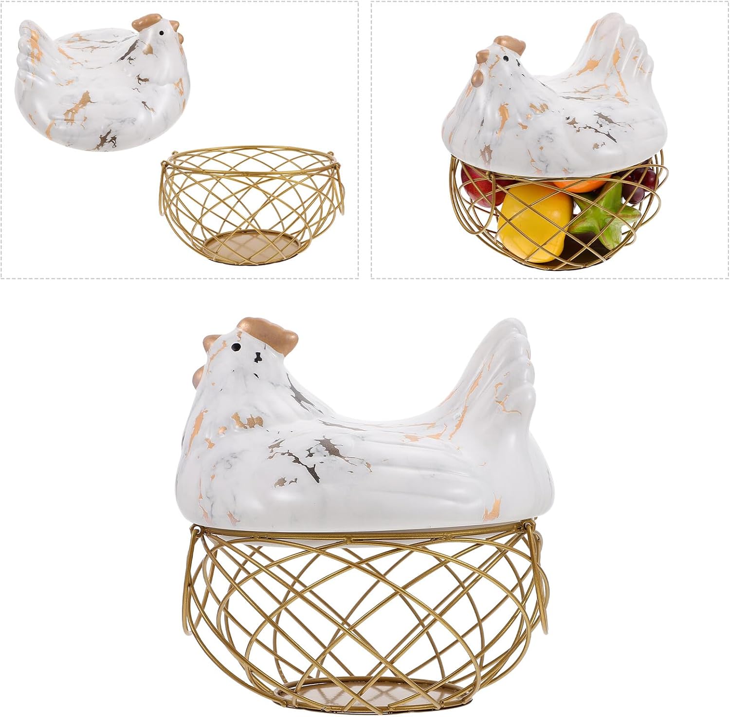 Package List 1 x Storage Basket Characteristics -Material: Ceramic, iron. -Product Info:Wrought iron storage basket - The hen shaped lid design makes the storage basket more attractive and eye-catching fruit storage basket. - A wonderful housewarming gift for your family and friends Egg Storage Basket. - Farmhouse style, suitable for most home decoration styles fruit holder. - Perfect for storing fruits, snacks, eggs, garlic, potatoes, etc egg storage basket for countertop. - Enough space for storing your various items and keep them well organized egg basket for gathering fresh eggs.Goods Informationfruit holder Simple and practical, it can store your food and other items, but also can decorate your home.small egg basket Made of iron and ceramic material, it is and .fruit basket If you are looking for a storage basket, then you miss our storage basket