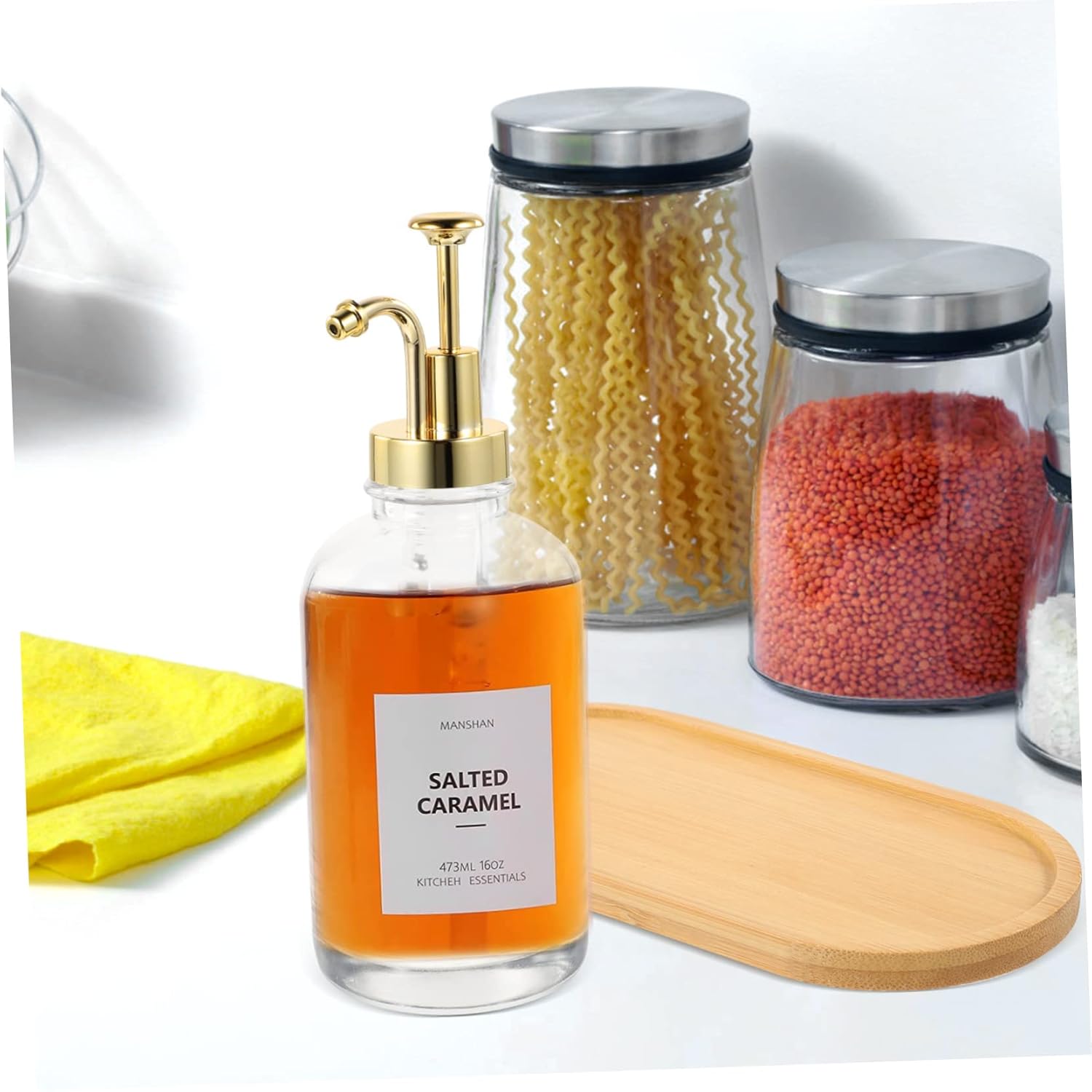 Package List 2 x Syrup Dispensers 1 x Tray 1 x Sticker Characteristics -Color:Golden ketchup dispenser -Material:Glass, Wood lotion bottle -Size:23.00X7.50X7.50cm/9.04X2.95X2.95in coffee bar accessories -The syrup dispenser is equipped with a pump lid to keep dirty items from the food inside coffee syrup dispenser for coffee bar. -Transparent design of this syrup dispenser makes you can observe the rest clearly and easily coffee syrup pump dispenser. -It has a simple design, but very in use, bring much convenience to you syrup pump dispenser. -The pump bottle is for storing juice, and also can be used as a honey pot, and more syrup pourer. -Compact and small, this honey dispenser is easy to store, not taking up any space simple syrup bottle.Goods Descriptioncoffee syrup with pump The kitchen assistant for holding honey or syrup, and can be used for lotion and so on.glass syrup bottle This transparent dispenser allows you to easily take out, which bring much convenience to your life.coffee station accessories This product is a pump bottle, adoption of and material