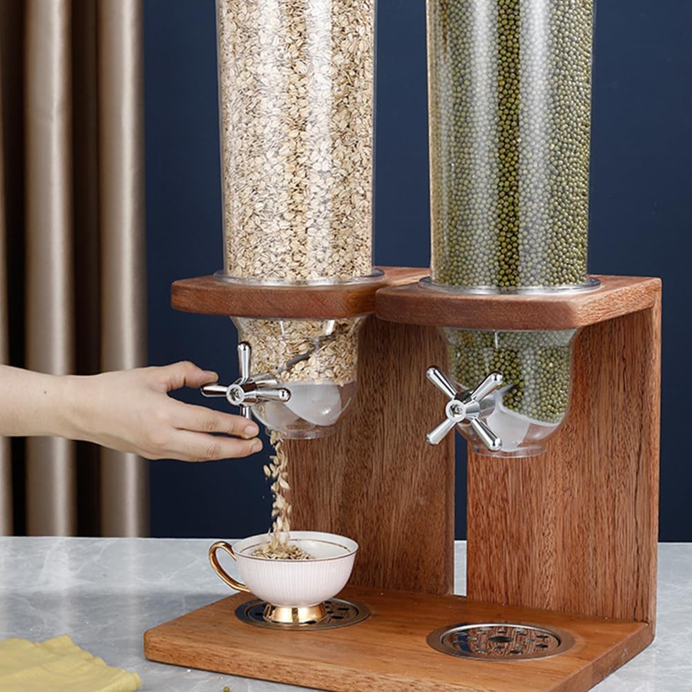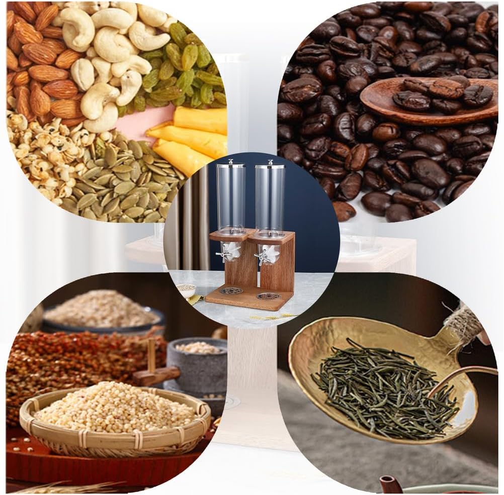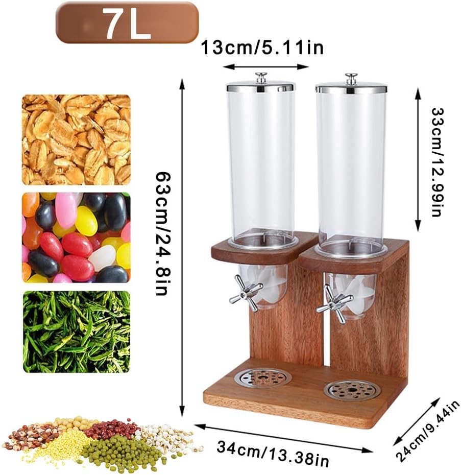 Key features:Easy access: The removable steel cover allows for effortless refilling from the top.Elegant design: Features a classic one-piece style with a high-quality wooden base that seamlessly integrates with your countertop.PC transparent barrel: Allows you to monitor grain quantity and quality at a glance.Gentle dispensing: Equipped with flexible paddle wheels that dispense controlled portions without crushing grains, ensuring zero waste and mess.Convenient cleaning: The cereal container is detachable for easy filling and cleaning.Stylish appearance: Enhances your kitchen or home décor with its modern look.Versatile use: Ideal for homes, malls, coffee shops, bars, grocery stores, and more.Specification:Name: Dry Food Containers and Grain DispensersMaterial: PC barrel body, steel lid, solid wood basePacking list:1 cereal dispenserCapacity: 7LPacking List: 1 x Grain Dispenser
