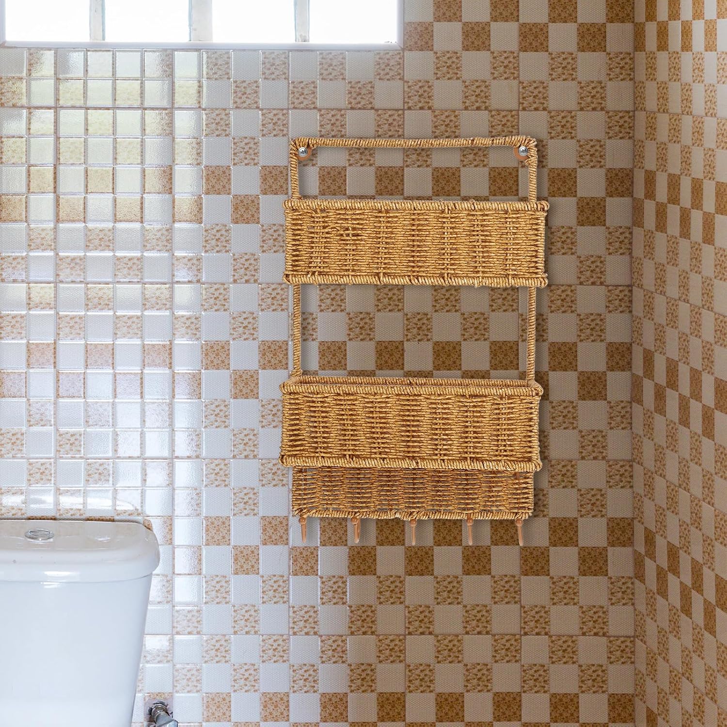 • Natural Woven Basket Appearance: Featuring a woven rattan simulation design in light brown, this hanging fruit basket adds a rustic and natural aesthetic to your kitchen or bathroom decor while keeping items neatly organized