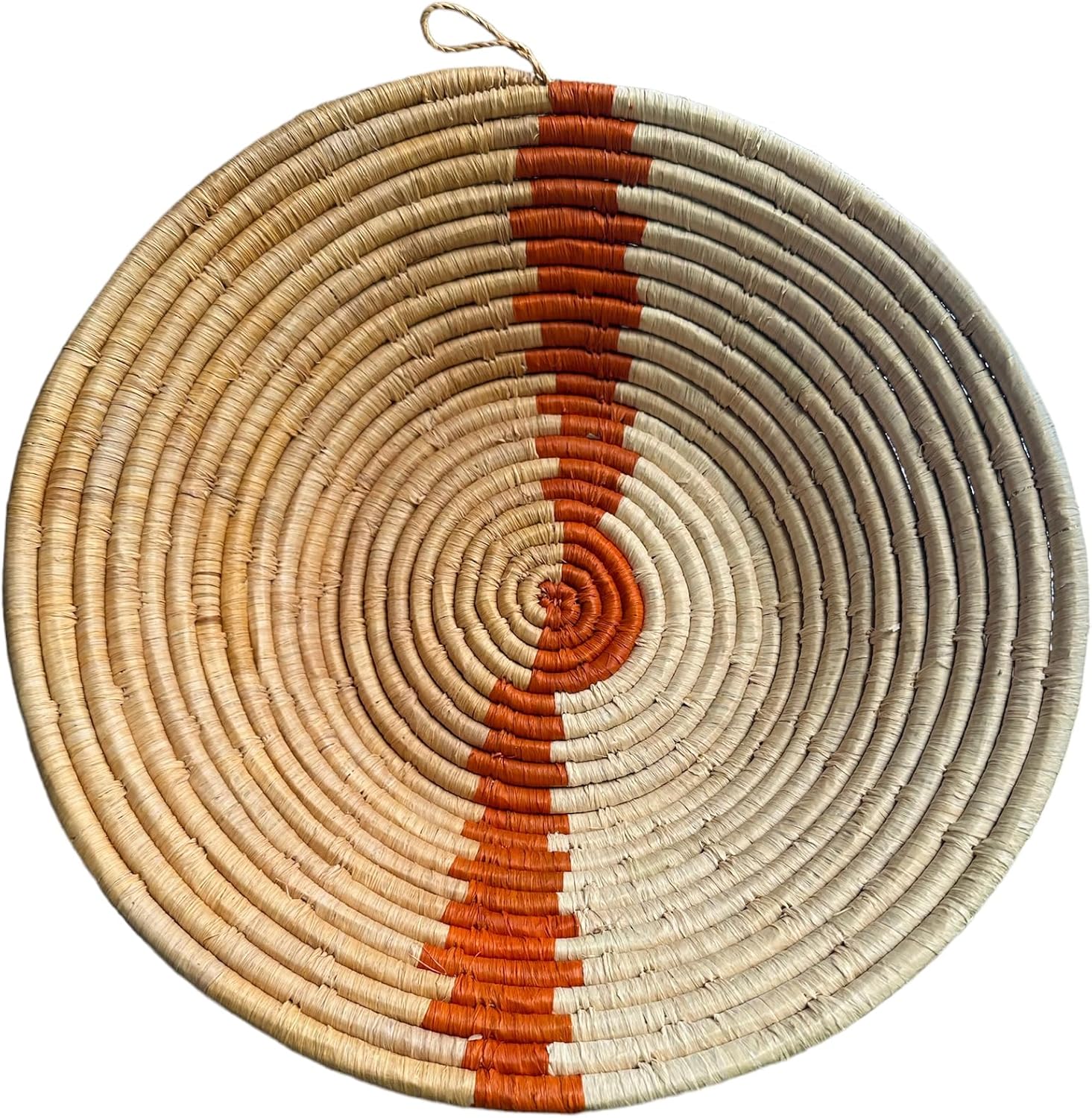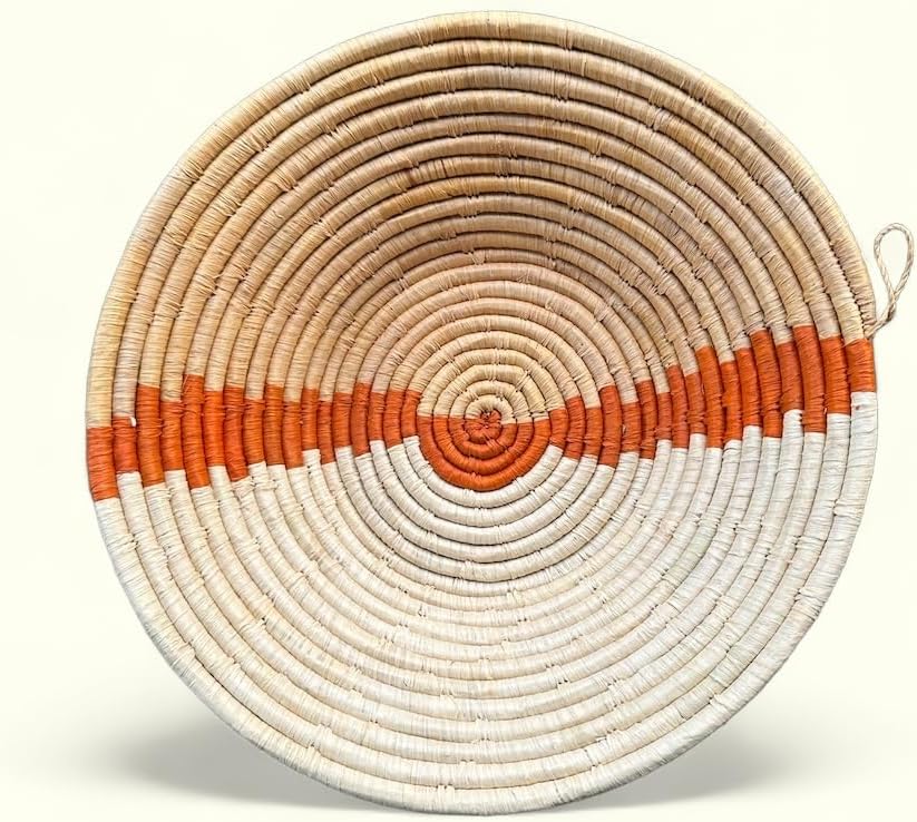 This perfect center piece Rwanda basket, African basket, Boho basket made of sweet grass and sisal. It can be used as bread/fruit bowl,wall art, wall decor. It comes with a loop in the back which, can be used as a wall hanging basket or given out as a gift. It's a stunning one-of-a-kind pieces rich in cultural meaning and purpose -- a perfect center piece, bread/fruit bowl, or wall hanging. Whether as a wall hanging or displayed as a centerpiece, these traditional baskets lend versatility around any home. Each bowl is intricately hand woven by The African Home Goods in Rwanda Baskets carry a special symbolism in Rwanda: friends give them to one another to celebrate milestones (weddings, births, etc.), and they are proudly displayed as a reflection of abundance in friendships, family and life. Safe to use with food Includes a hang loop on the back for option of wall decor Made by hand in Rwanda using organic dyes and all natural fibers of sisal and sweet grass *All products are made by hand with love and vary slightly in color and size Care Instructions: -Made of natural fibers and grass; do not submerge or wash with water. -If necessary, use a damp cloth to wipe the basket clean.