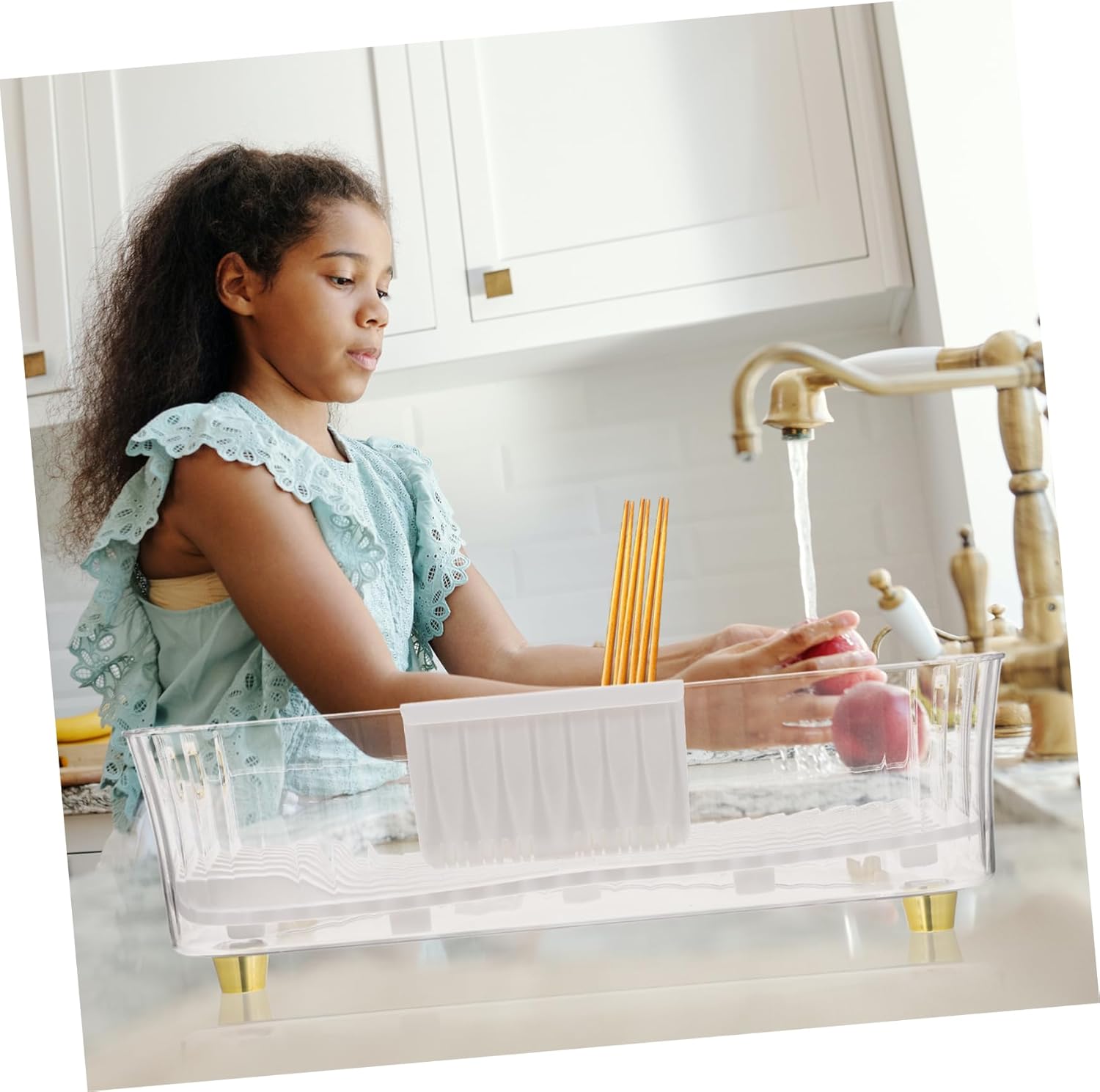Package Include 1 x dish drying rack Characteristics -Material:PET, PP tableware draining holder - Color: Transparent vegetable drainer - Size: 42.50X26.50X13.00cm/16.70X10.41X5.11in dish rack -Fashionable design and modern finishes add a stylish feel to your kitchen. Not only can dry bowls, cups and plates, but also ideal for drying fruits and vegetables dish chopsticks rack. -The drying storage basket can hold dishware for easy access and keep them dry and tidy always countertop dish drain holder. -Leave more room in cluttered countertop to keep the kitchen looking organized and tidy dish drying rack. -Humanized design, avoid scratches, protecting your safety. Dish drying rack is very practical and helpful kitchen storage rack. -Excellent workmanship and fine details its popularity and durability, which is easy to use kitchen plate organizer rack.Goods Descriptionfruit drainer You can drain of dishes at once and the dish rack itself does not take up much space next to the sink.convenient dish rack The anti-slip feet will protect your sink surfaces whilst providing stable storage and air flow under your glasses, cups, bowls, small pots, and pans