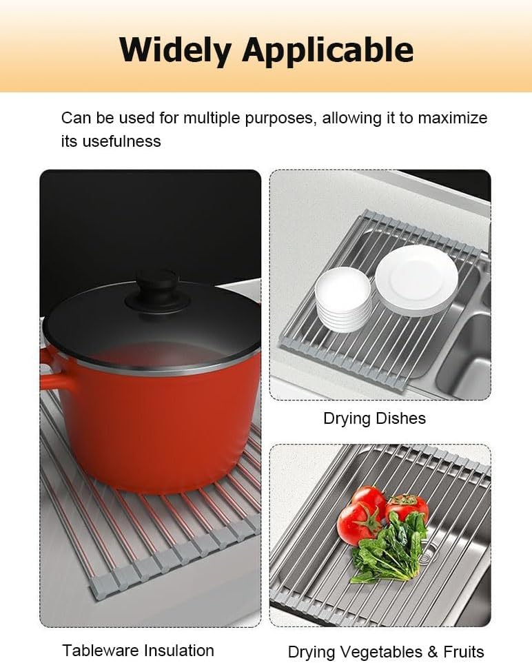 Are you still troubled by the dripping of washed vegetables and fruits everywhere?Our foldable sink drying rack is sturdy, waterproof, and can easily drain water from dishes, vegetables, and fruits. Simply place it above the sink and use it without taking up spaceSpecificationMaterial: Stainless steelSize: L x WColor: Gray, BlackFoldable: YesFeatures1. The expandable roll up drying rack is composed of stainless steel rods and silicone edges, which are sturdy and can be used for a long time2. Foldable stainless steel drainer is waterproof, easy to clean, and can be wiped clean immediately3. The sink dish drying rack features a rollable design for easy storage and organization, without taking up space4. The heat resistant dish drying mats for kitchen counter to place hot bowls, hot pots, bakeware and other kitchen hot stuff5. Convenient sink cover to place chopping and cutting board and prepare food6. Dish drying rack over the sink adjustable for air-drying washed kitchenware like bowls, pans, glasses, cups, plates, cookware and morePackage Include:1 x Roll Up Dish Drying Rack Note:1. Manual measurement, product size may exist 1 ~ 2 cm error2. Due to light, equipment, shooting angle and resolution of the computer, there will be small color difference, in kind prevail3. In order to get a suitable collapsible sink drying rack, please kindly measure your kitchen sink or platform before choose