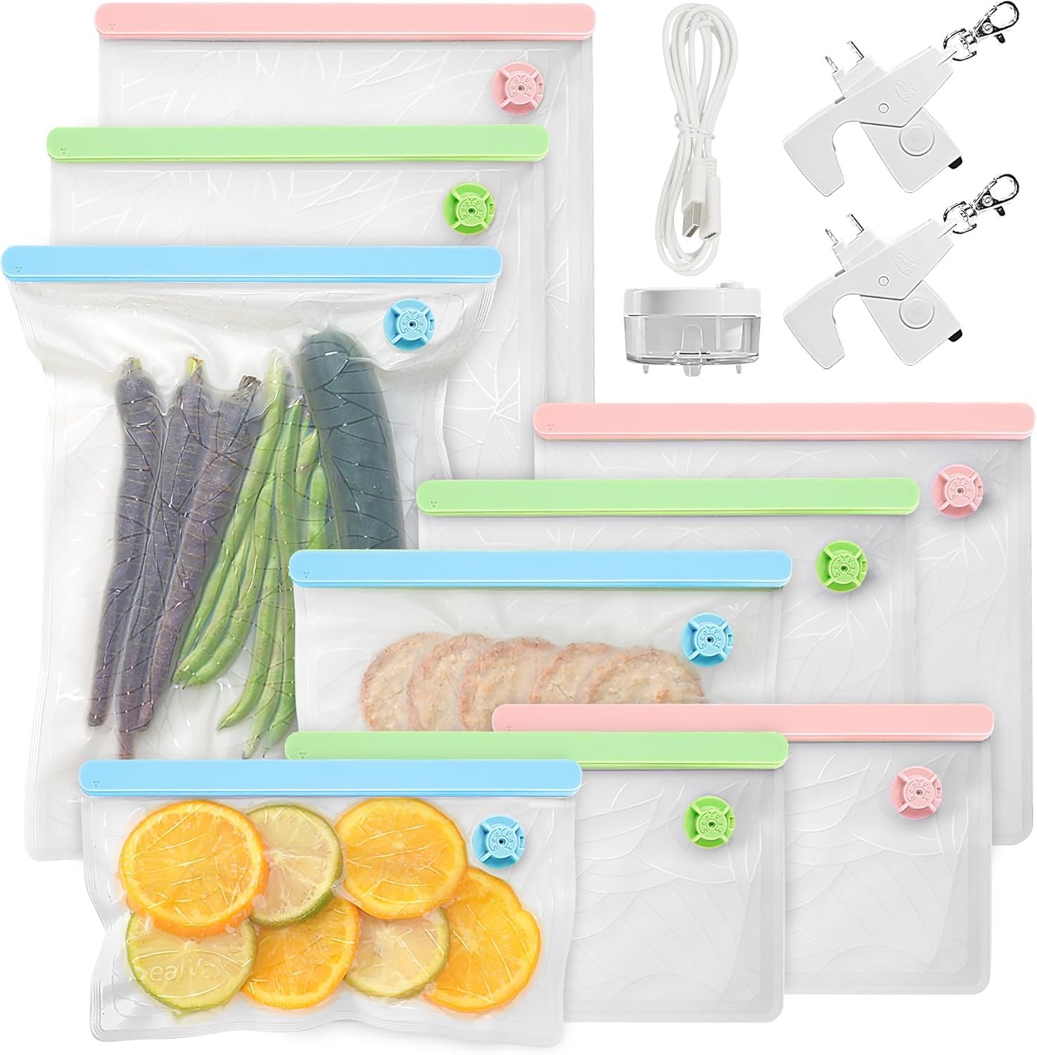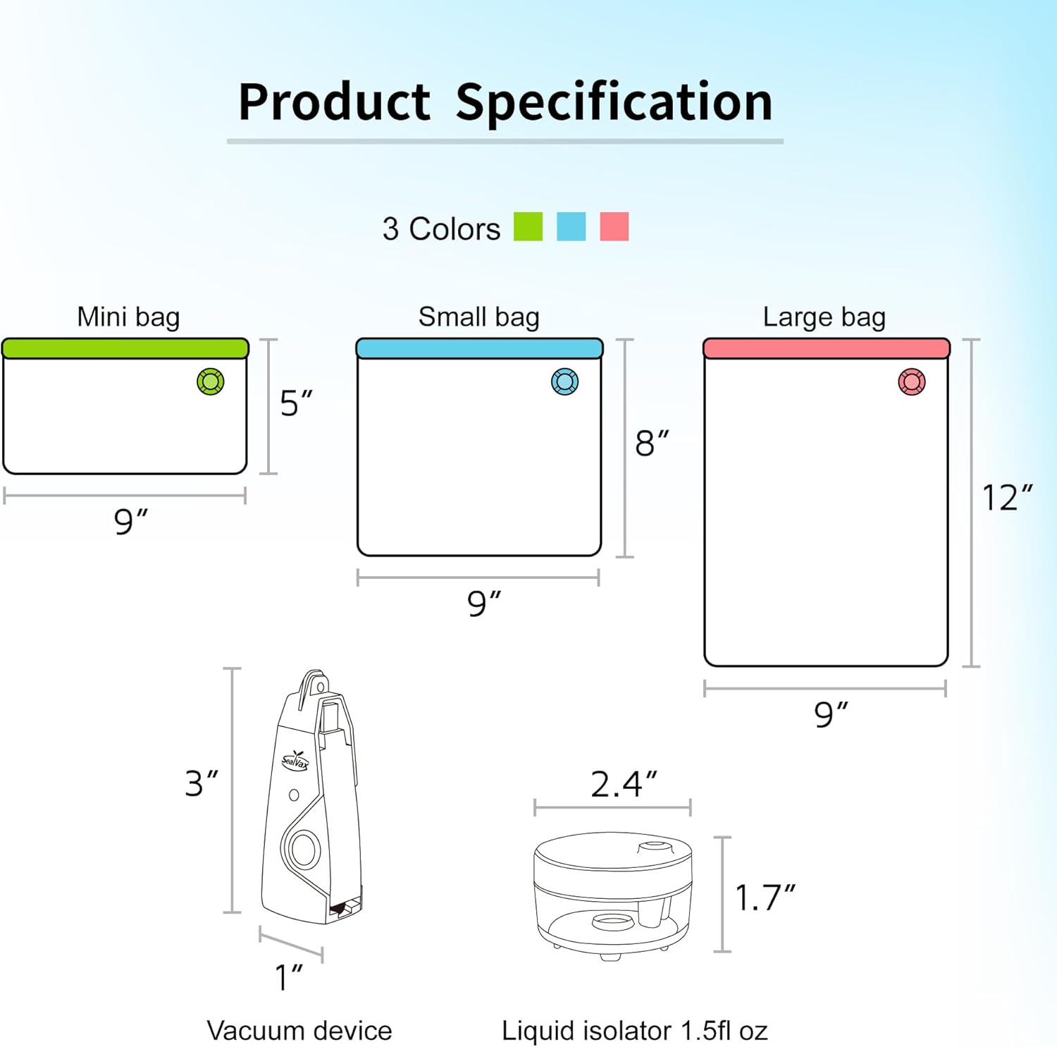 • 【Package Contents】This package includes 2 x SealVax minimalist vacuum devices, 3 x Large bags ( 12 x 9 inches), 3 x Small bags ( 8 x 9 inches), 3 x Mini bags ( 5 x 9 inches), 1 x Female USB-C extension cable, 1 x Liquid isolator.