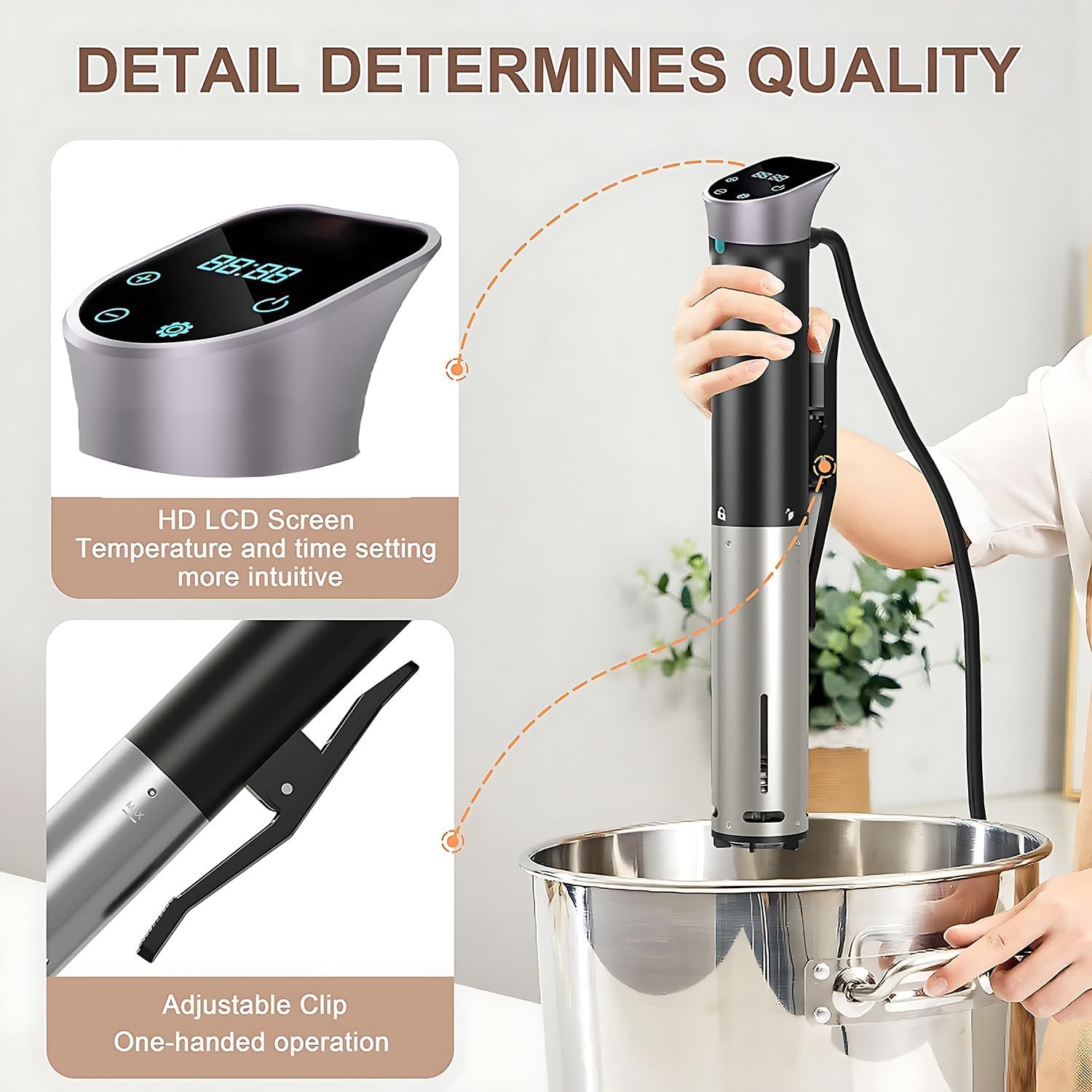 In terms of taste, Sous vide cooking can heat the food evenly, Avoiding the burnt outside or over-drying inside that may be caused by traditional high-temperature cooking. Whether it's tender and juicy meat, Delicate fish or a variety of vegetables, They all present an amazing taste. Whether it is a home kitchen or a professional restaurant, Sous vide cooking machines are constantly changing the methods and standards of cooking, Bringing people a new gourmet experience. Specification: Product Name:Sous Vide Machine Product Color: Black Product Materials: Stainless steel Product size: 380mm x105mm x 92mm Product Weight:1100g Rated power: 1200W Maximum water circulation: 23L Water tank capacity: 12L Water tank size: 26 x 28cm Set temperature range: 25-95℃ Actual temperature display: 0-99.9℃ Set time range: 00:01-99:99H Status: New Number of Units: 1 Standard Product ID: 1 Package list: 1 × Sous Vide Machine Rated voltage (appliances or chargers): AC110-240/50HZ;