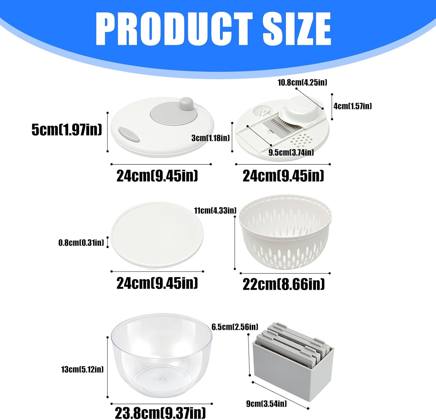 Family Size Large 5L Bowl Salad Maker And Dehydrator Quick Systems Efficient Drying Whole Lettuce Preparation Features : This versatile salad spinner a design , integrating slicing , shredding , grating , juicing , and dehydration functions in compact device for efficient vegetable and fruit preparation Featuring a large 4.5 to 5 liter capacity bowl , an easy to use knob for rapid dehydration , a secure lid to splashing , and a not slip base with an ergonomic handle for stable , safe operations Ideal for conscious individuals and home chefs seeking tools for , crisp salads and meal preps without extra effort Perfect for family gatherings or daily cooking , enabling quick washing and drying of whole lettuce and greens to maintain kitchen As a multifunctional kitchen companion , this vegetable slicer and dehydrator enhances culinary efficiency while supporting eating habits Specifications : Materials : ABS+PP+PS+420J2 stainless steel Product size : 24x18cm ( as shown ) Capacity : 4.5L ( 5L ) Main functions : slicing , shredding , grating , juicing , Package Includes : Salad dehydrator setx1 Note : Pay attention to the storage methods
