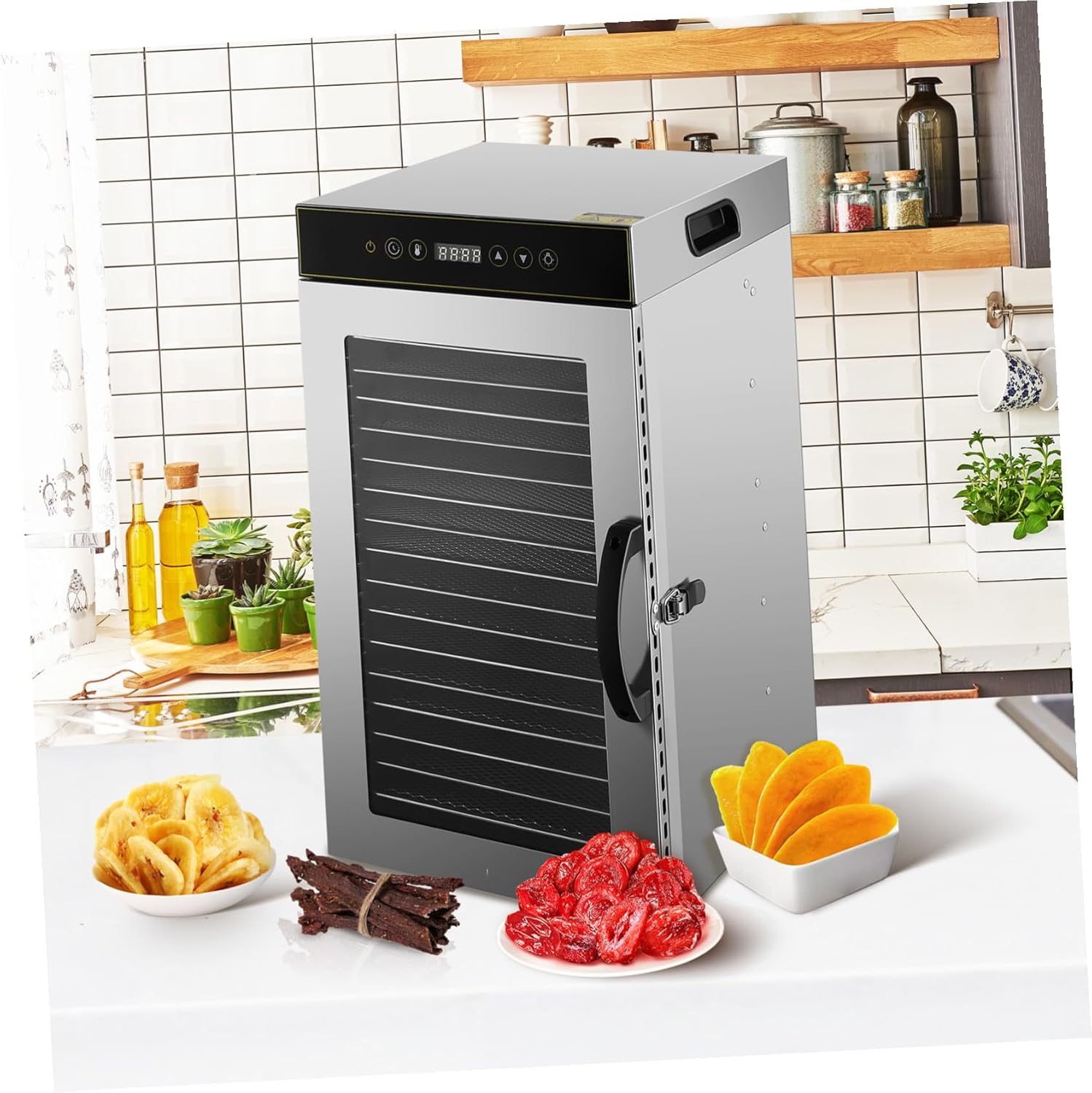 Package Include 1 x food dehydrator Features -Number of product layers: 18 layers countertop dehydrator -Tray size: 20x29cm fruit and vegetable dehydrator -Product Info:Food Dryer -Efficient Drying: The powerful drying mechanism removes moisture, enhancing the flavor and shelf life of your favorite ingredients multifunctional food air dryer -Temperature range: 30~90℃(86~194℉) fruit meat dehydrator -Enhanced Food Preservation: By removing moisture, this dehydrator helps to maintain the nutritional integrity of your food, ensuring you enjoy wholesome snacks commercial food dryer -Space-Saving Design: Its compact footprint allows it to fit seamlessly on your countertop or in your kitchen storage, accessible for daily use food air dryer -Material:Stainless steel commercial food-dehydrator machine -Power: 800w commercial meat dehydrator -Size: 54.00X31.00X30.00cm/21.22X12.18X11.79in electric dehydrator food dryer -Color:Silver household food dehydratorGoods Descriptionfood dehydrator commercial Note: This item comes with US plug, please confirm the voltage of your area before purchasing This home food dehydrator features a dual-layer structure and stainless steel design, nice for drying meat, fruits, and nuts.stainless steel dryer Its 18-layer capacity allows for efficient dehydration, ensuring your food retains its nutrients and flavors.fruit vegetable dryer Ideal for both household and commercial use, it offers a versatile option for preserving a variety of foods