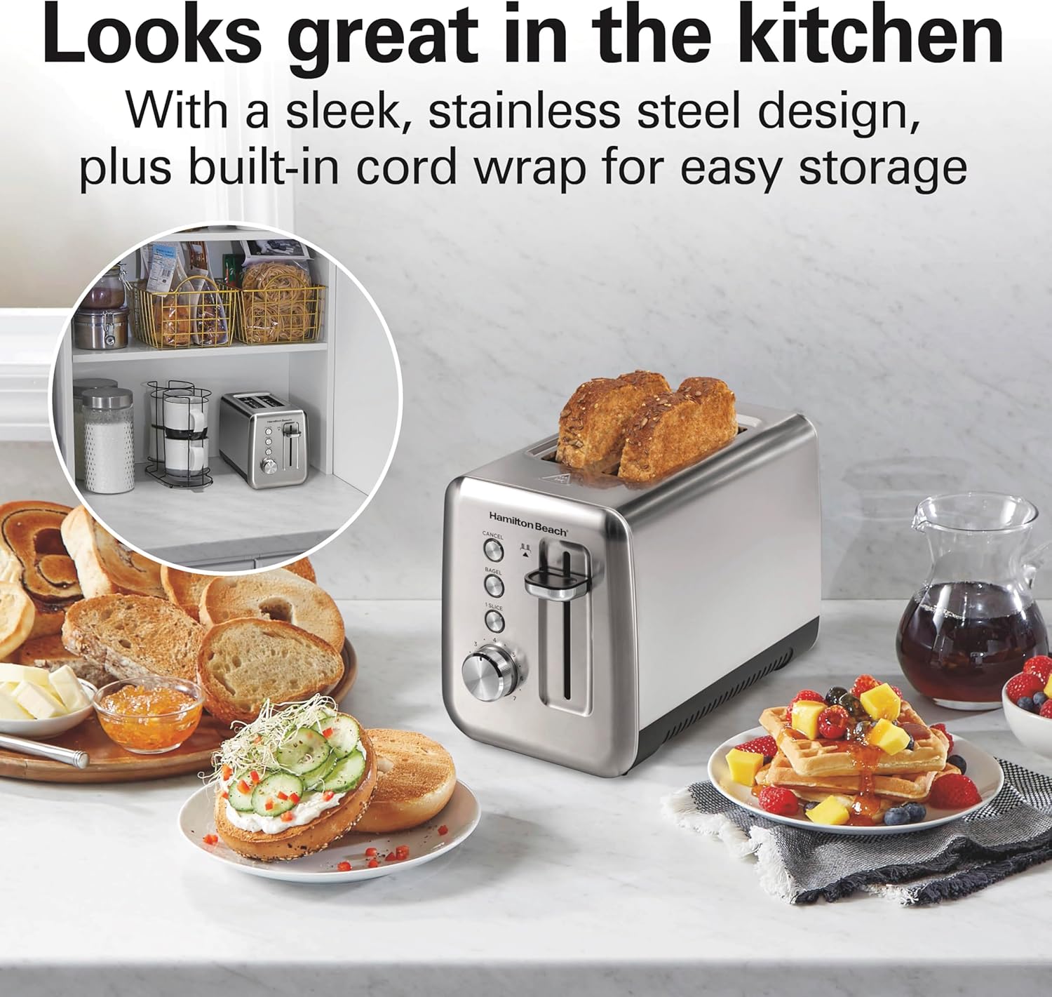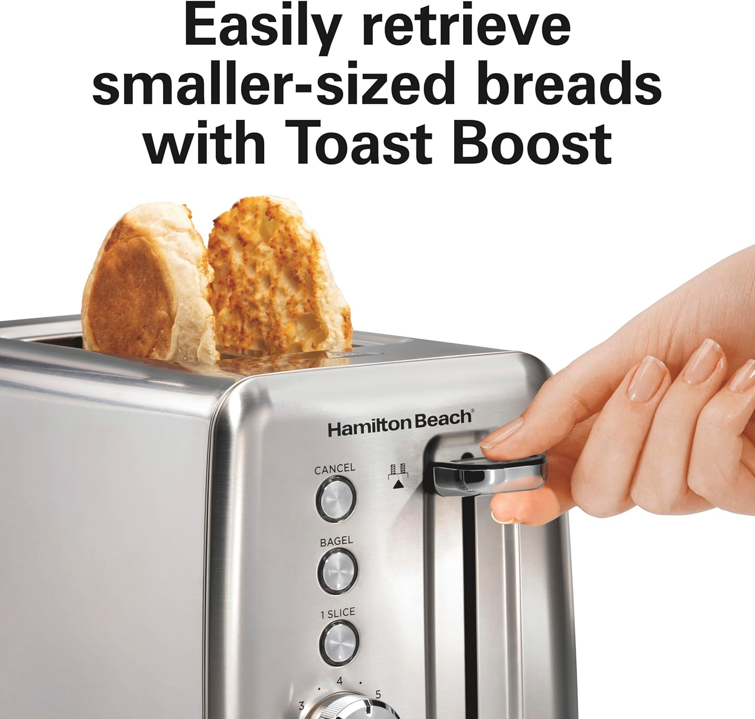 The Hamilton Beach® Sleek Stainless Steel 2 Slice Toaster has Sure-Toast™ technology to ensure balanced color and texture on both sides of bread, even when toasting one slice. Convenient features include bagel and cancel buttons, and Toast Boost.