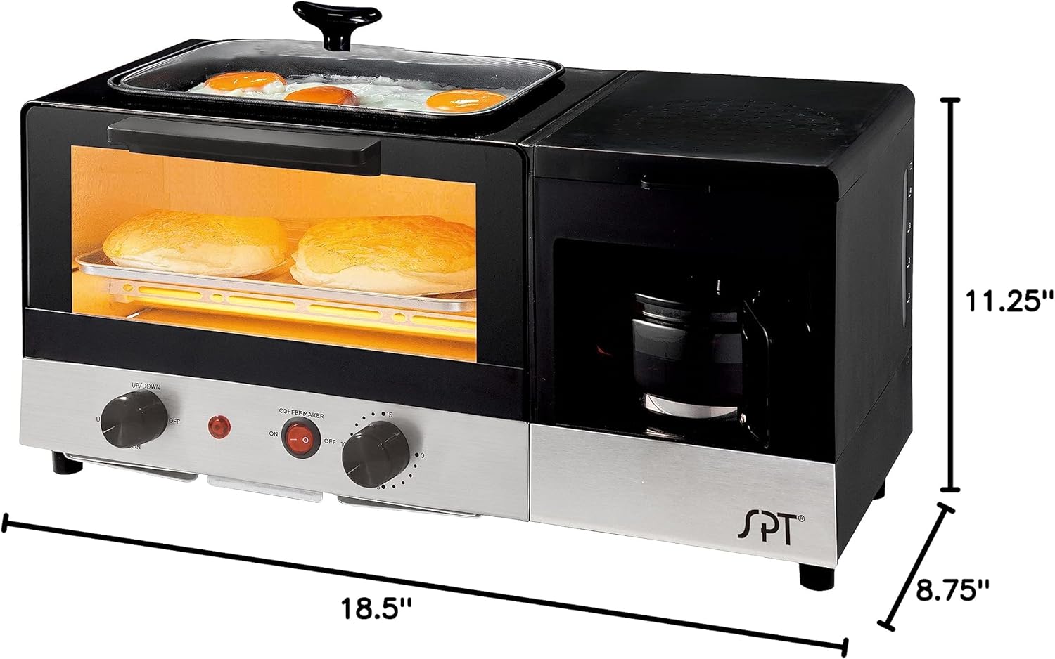 SPT 3-in-1 Breakfast Maker combines all the breakfast necessities into one: Toaster Oven, Coffee Maker and Oven-Top Griddle. The new black cabinet with stainless steel control panel gives it a modern and sleek look. This is the perfect compact appliance for dorms, offices, RV’s, studios or wherever space is limited. You can brew a fresh cup of coffee, toast couple slices of bread and fry up an egg all at once!