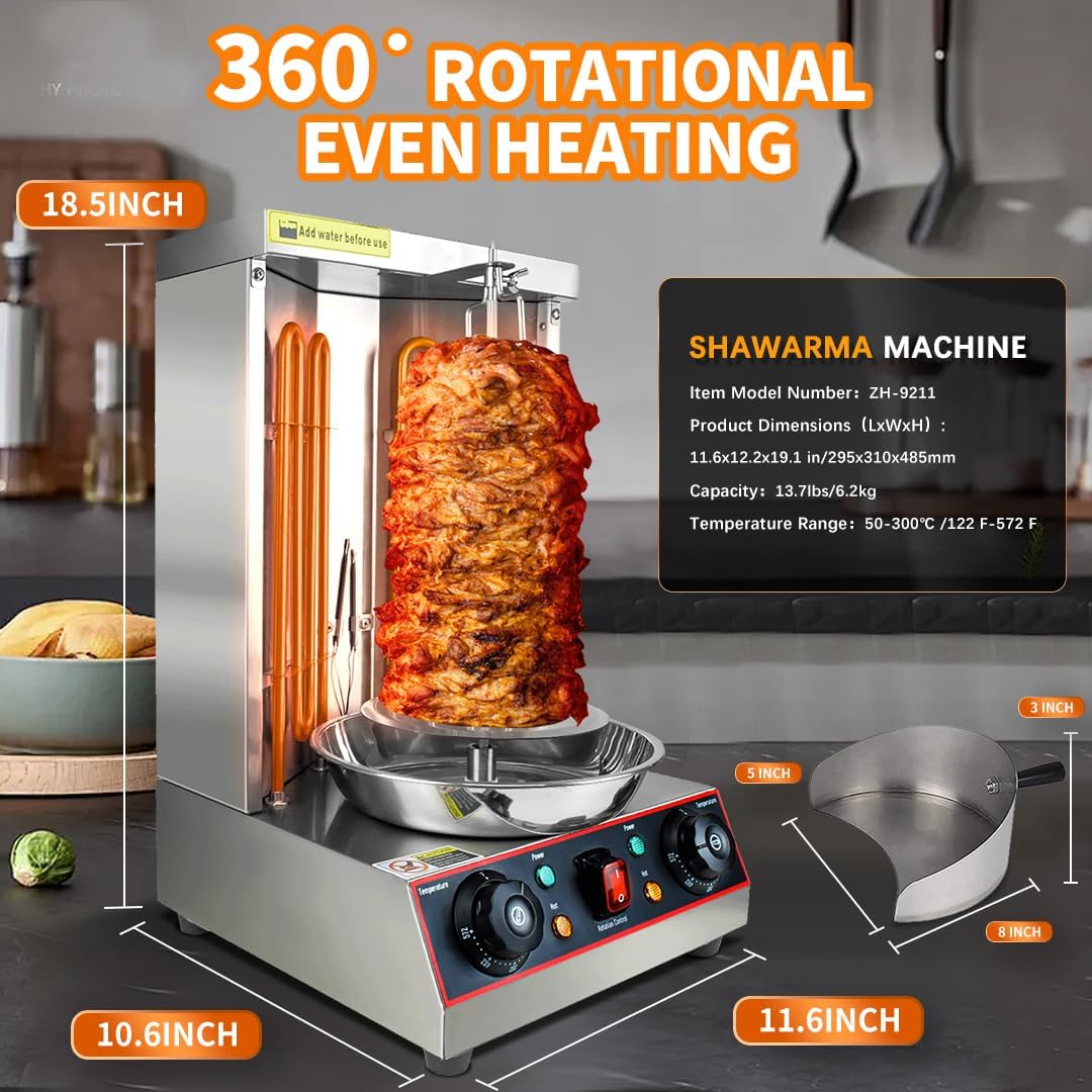 Electric Shawarma MachineSpecificationColor: SilverMaterial: stainless steelDimensions: 11.8 x 11.8 x 18.9 in.Shipping weight: 8 kg/17 lbsWeight: 5 kg/11 lbsPower: 3000 wattsPackage Includes Electric gyro grill × 1 Operation manual × 1 Meat catching spatula × 1If you have any questions about the product, please feel free to contact us.Electric Vertical Rotisserie Shawarma Grill Machine1. The whole machine is made of food-grade stainless steel, which is more sturdy and durable, and the socket underneath is designed to make your cooking safer.2. The grill can be freely adjusted from 50-300°C (122-572°F), you can set different temperatures for different foods.3.Removable vertical skewer makes you clean more conveniently, adjustable height and tray underneath.4. Rotisserie cooking makes the food more evenly heated and more delicious, the heating element is open structure.5.Adaptable to various scenes, perfect for family gatherings, commercial barbecues and picnics.