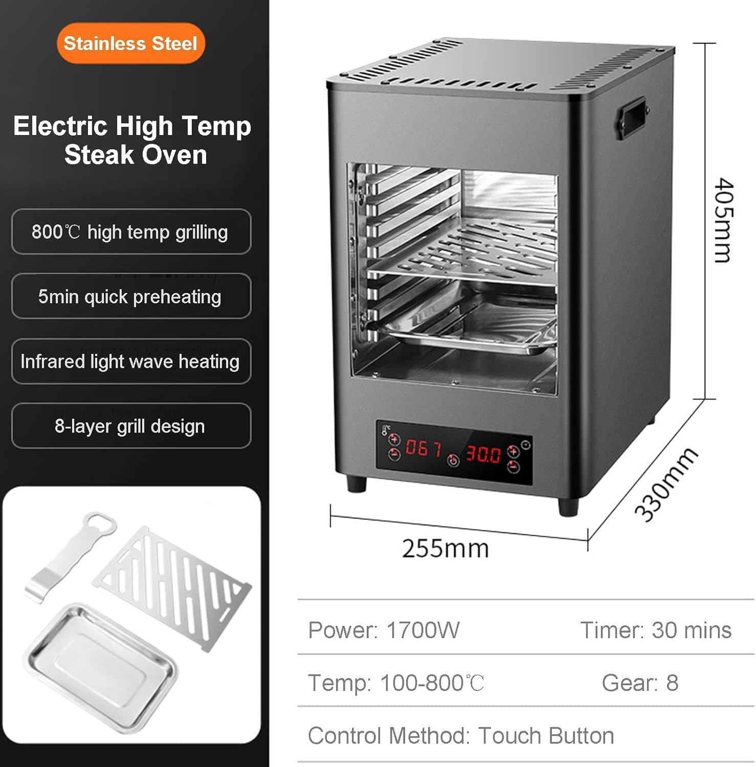 ENJOY RESTAURANT-QUALITY STEAK AT HOME Elevate your dining experience with our innovative indoor electric steak grill, designed to reach an impressive temperature of 1472°F, allowing you to enjoy perfectly cooked steak in just minutes. TOP-DOWN GRILLING FOR EXCEPTIONAL FLAVOR Our electric grill features a unique top-down heating method that ensures your steak is beautifully caramelized and bursting with flavor, bringing that gourmet touch right into your kitchen. CUSTOMIZE YOUR STEAK TO PERFECTION Whether you prefer your steak well-done, medium, or rare, our grill provides the flexibility to prepare your meat exactly to your liking, making it suitable for every palate. USER-FRIENDLY LCD CONTROL PANEL With a sleek digital touch panel, you can easily monitor temperature and timer settings, ensuring precise cooking every time for a hassle-free experience. VERSATILE MULTI-LAYER SHELF DESIGN Select from our 3-layer or 8-layer models to meet a variety of cooking needs. Ideal for grilling not just steaks but vegetables and more, this indoor grill adapts to your culinary creativity. PRODUCT SPECIFICATIONS - Product Name: Indoor Electric Steak Grill - Material: Stainless Steel - Power: 1700W - Control: Touch Button - Temperature Range: 100-800°F - Timer: Adjustable from 0-30 minutes MODEL OPTIONS: - Model A: Weight: 7.8kg, Size: 25.5X33.0X30.5cm, Inner Tank Size: 20.2x29.9x22CM - Model B: Weight: 9.3kg, Size: 25.5X33.0X40.5cm, Inner Tank Size: 20.2x29.9x27cm - Model C: Weight: 13.6kg, Size: 35.5X38.5X40.5cm, Inner Tank Size: 30.1x36.1x27cm PACKAGE INCLUDES: 1 x Automatic Steak Broiler 1 x Tray 1 x Grill 1 x Grill Handle