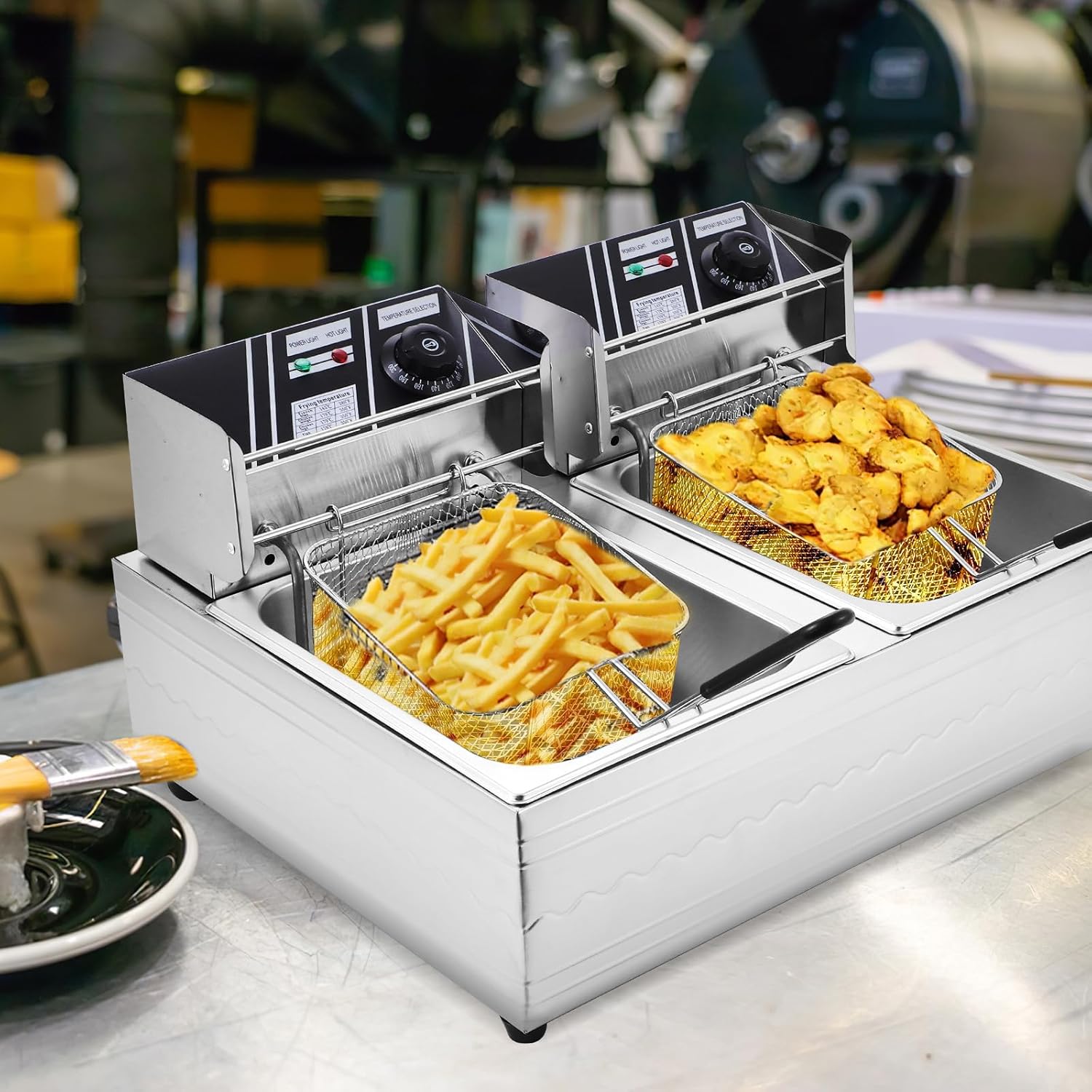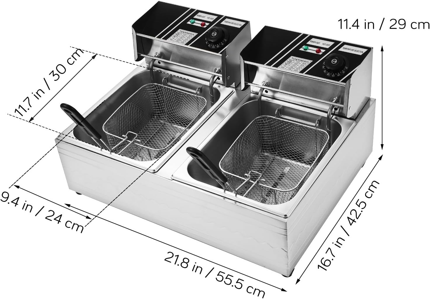 Description This commercial countertop electric double tank deep fryer is designed for frying large quantities of food such as chicken and fries. It features a stainless steel construction for durability and easy cleaning. The fryer maintains a consistent temperature, allowing perfectly fried food every time, making it ideal for restaurant use. Features Oil tank size: 240x300x150mm Strainer size: 185x210x100mm Input Power: 1250W+1250W -Color:Silver -Material:Stainless steel -Size:55.50X42.50X29.00cm/21.81X16.70X11.40in -Size:30.00X24.00X15.00cm/11.79X9.43X5.89in -Large capacity design: designed with a spacious double tank, this deep fryer accommodates large quantities of food, making it ideal for commercial use in busy kitchens -Precise temperature control: equipped with advanced thermostatic technology, it allows consistent heat distribution for perfectly cooked meals every time - operation: the independent system allows simultaneous frying of different foods, enhancing efficiency and versatility in food preparation -Stainless steel build: made from stainless steel, this electric deep fryer is resistant to wear and tear, easy to clean, and built to last -Versatile application: perfect for restaurants, fastfood outlets, and catering services, it in preparing fried chicken, french fries, and other delicious dishes