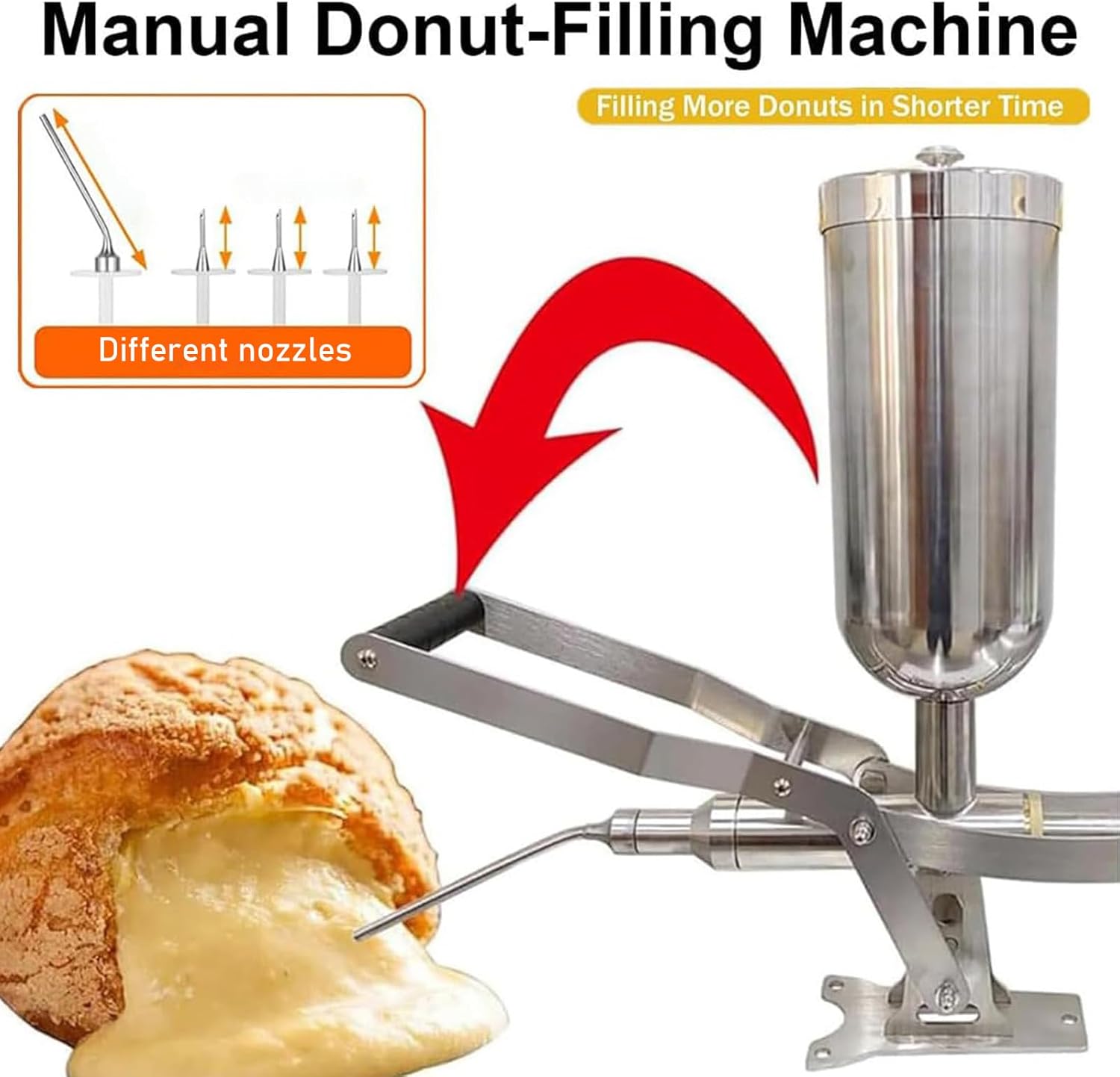 This manual filling machine is made of stainless steel with a brushed and mirror finish, featuring good heat resistance for safe use with hot fillings like melted caramel or warm fruit compotes. It comes with a large-capacity hopper, reducing frequent refills, and multiple nozzles — the extended downward-angled design ensures fillings flow fully into donuts, churros, or small pastriesWith precise filling accuracy and adjustable filling volume, it avoids material waste while meeting different taste needs. The machine has a stable Y-shaped base with mounting holes, which can be fixed to countertops to prevent slipping during use. It’s easy to assemble and clean, with removable parts that simplify post-use maintenance, and compact enough to store in cupboards without taking up much space.Suitable for commercial scenarios like kitchens, bakeries, restaurants, cafes, and dessert shops, it works with smooth, particle-free fillings (cream, jam, paste)The smooth handle operation requires minimal force, so even extended use won’t cause hand fatigue, which is ideal for busy periods when you need to fill multiple pastries in a row.The stainless steel surface not only resists scratches from daily handling but also doesn’t absorb food odors or stains. Unlike plastic alternatives that may crack over time, the metal construction maintains its shape and reliability, even with regular contact with thick fillings like dense cream or thick jam