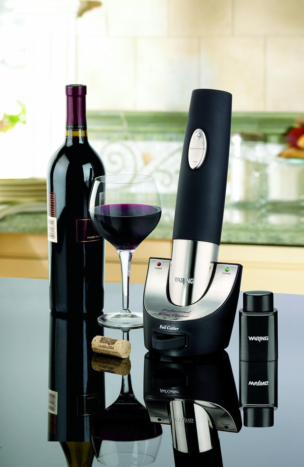 Waring has been making products for commercial kitchens for over 60 years. Today Waring Pro brings that expertise home with premium, commercial-quality products, including the Cordless Wine Opener. The Cordless Wine Opener effortlessly removes up to 80 natural or synthetic corks with one full charge. Entertaining friends and family is easier than ever, with Waring Pro. The ultimate in extravagant convenience, the Waring Pro Professional Cordless Wine Opener ensures effortless enjoyment of your favorite wines. Not afraid to tackle the synthetic corks that make other wine openers cower in fear, the Waring Pro can removes corks with just the push of a button--up to 80 on one full charge! The brushed stainless accents add a stylish touch to any kitchen countertop and a foil cutter is included for clean openings and tidy pours. This opener also includes a vacuum sealer to preserve flavor and freshness of unfinished wine.
