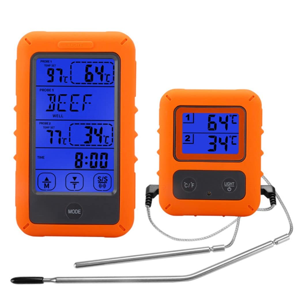 Description:- MATERIAL: Cordless Meat Thermometer is made of Plastic, Silicone, Stainless Steel, probe with a tapered tip design that enables users to get more accurate and faster readings with 1.8°F accuracy; the probe cord withstands Temperatures up to 716°F.- EASY TO USE: No need to sync, say goodbye to tedious setup steps; large LCD screen clearly shows food and oven temperature; backlit display allows use in low light conditions.- FEATURES: Wireless thermometer with four probes monitors the temperature of your food or oven/grill/smoker, allowing you to enjoy the company of your guests without constantly making excuses for yourself.- PACKAGE INCLUDED: 1 Main Machine + 1 Sub-Machine + 1 Meat Clip + 2 Probe.- FUNCTION: Food cooking smoke thermometer with count and countdown settings, for long cooking or vegetable side dishes; receiver will beep and flash once preset temperature is reached.Specification:Color: As shownMaterial: Plastic, Silicone, Stainless SteelSize: Main Unit: 6.7 x 3 x 12 cm/2.64 x 1.18 x 4.72 inSub-Machine: 6.7 x 2.3 x 8.5 cm/2.64 x 0.9 x 3.35 inPower Supply: 4 x 3A batteries (not included in the package)Package Included:Main Machine x 1Sub-Machine x 1Probe x 2Meat Clip x 1