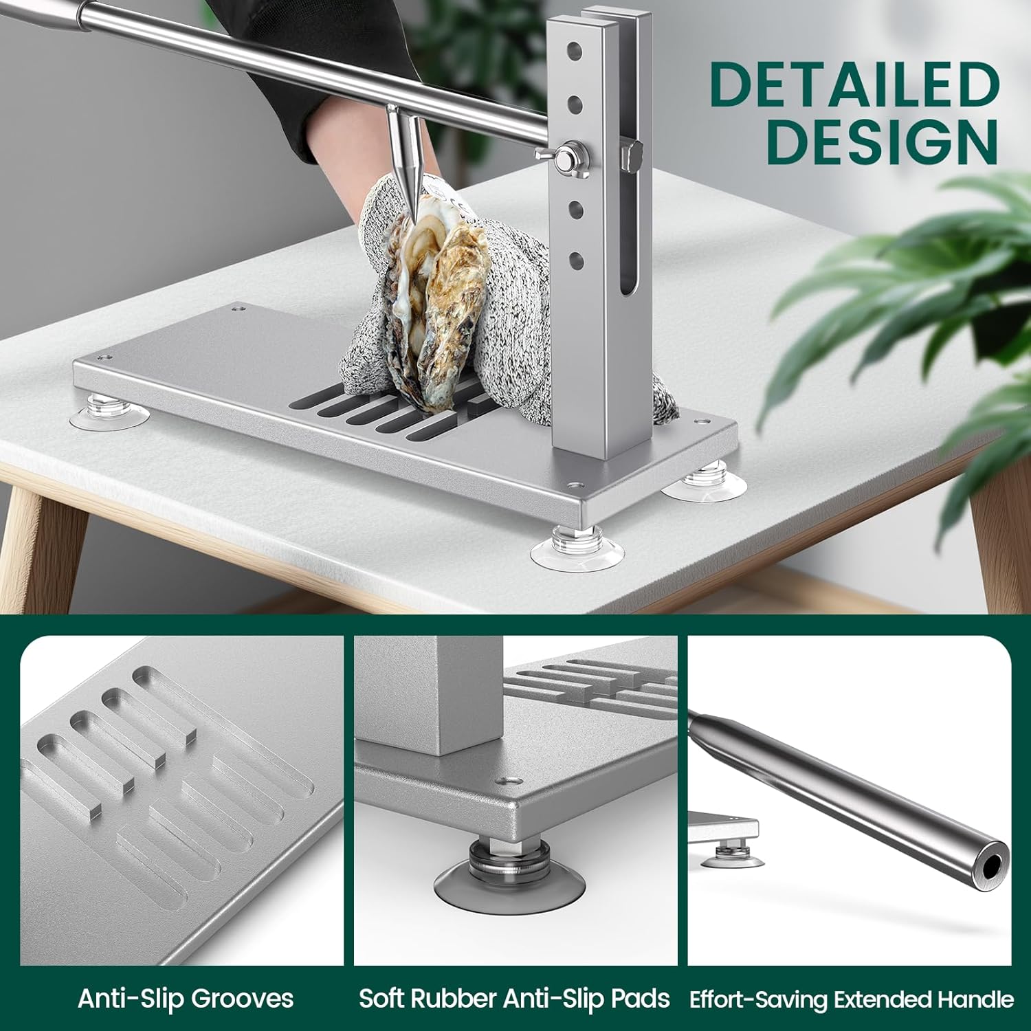 • EASY TO OPERATE: Fix the suction cup at the bottom of the machine, place oysters on the groove, aim the tip of the knife at the point where the upper and lower shells of the oyster are combined. Then press down the handle, using the provided knife to gently scrape the connecting muscles between the oyster meat and shell. Easy and convenient to use
