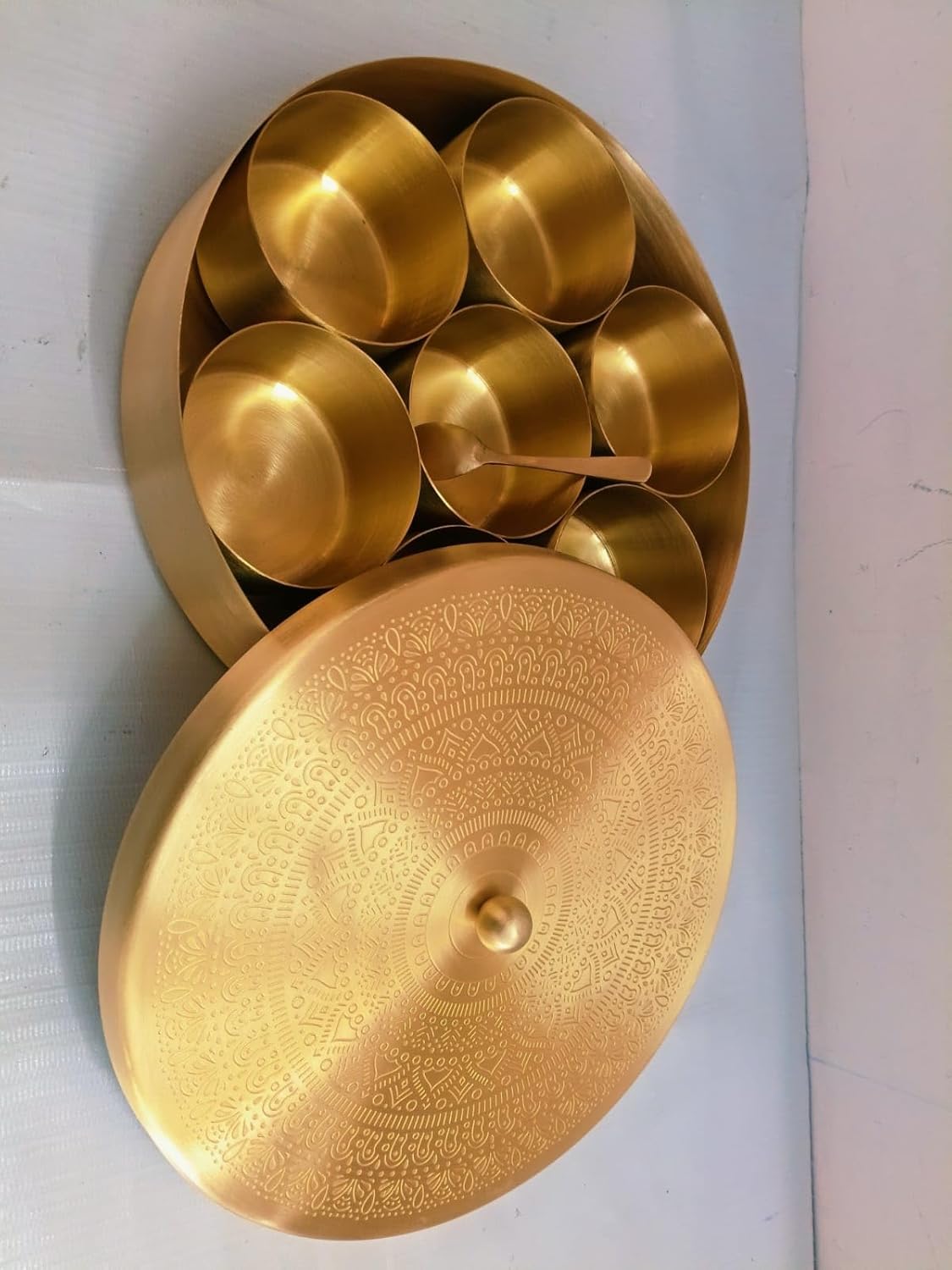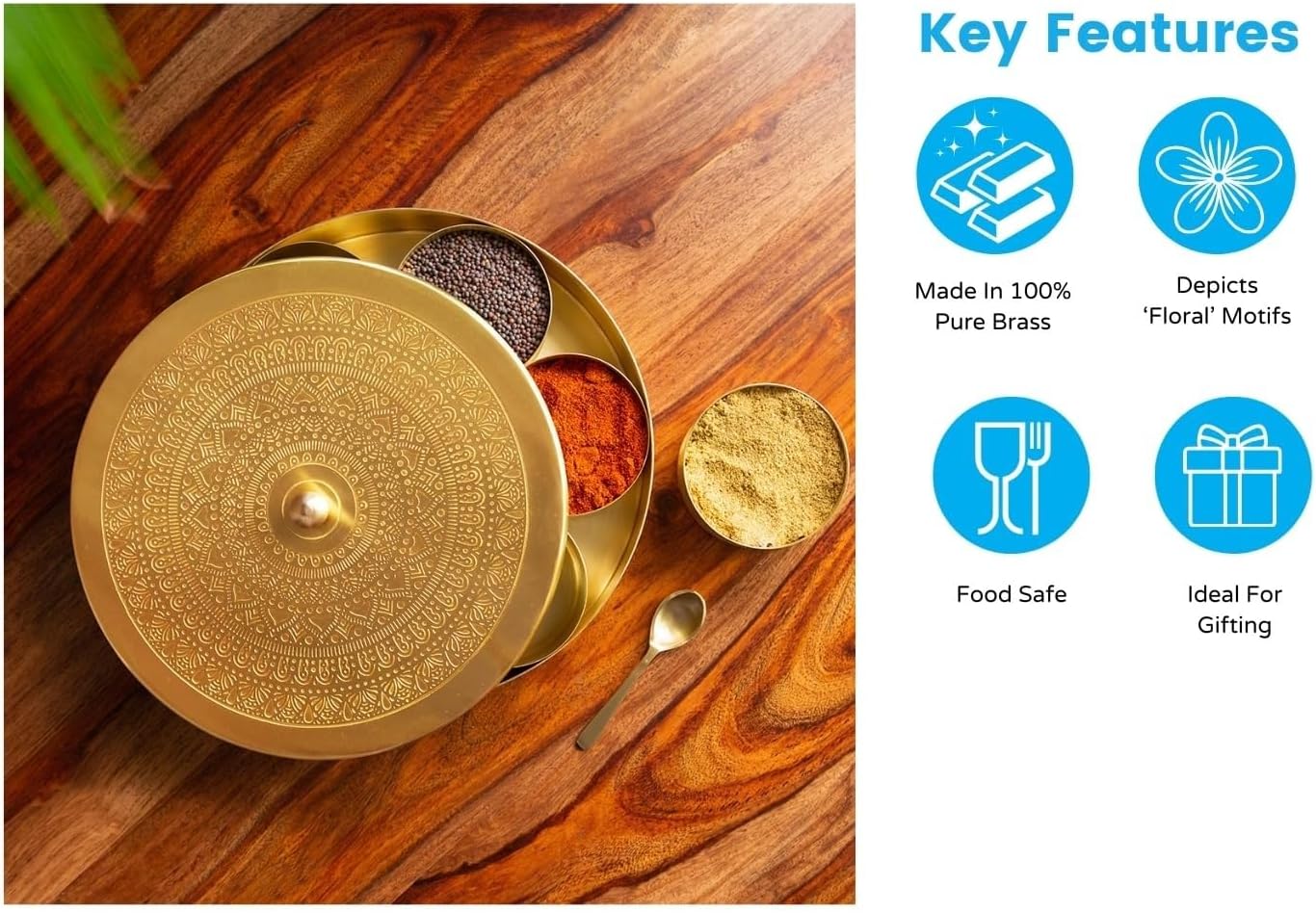 Product Description1. Ideal for storing 7 different types spices or refreshments like saunf, clove, cardamom etc.2. Package Content: 1 Box With Lid, 7 Containers, 1 Spoon.3. Handmade in India by Aritsans.4. Comes with 7 detachable containers of 100 ML each.5. Does not come with the spices as shown in the image. b) As this product is handcrafted there might be a slight color, design or size variation, which is natural and hence makes the product unique.Lost in agony was the city that had mined richness and which had gloated over its glory of art for the longest of generations.