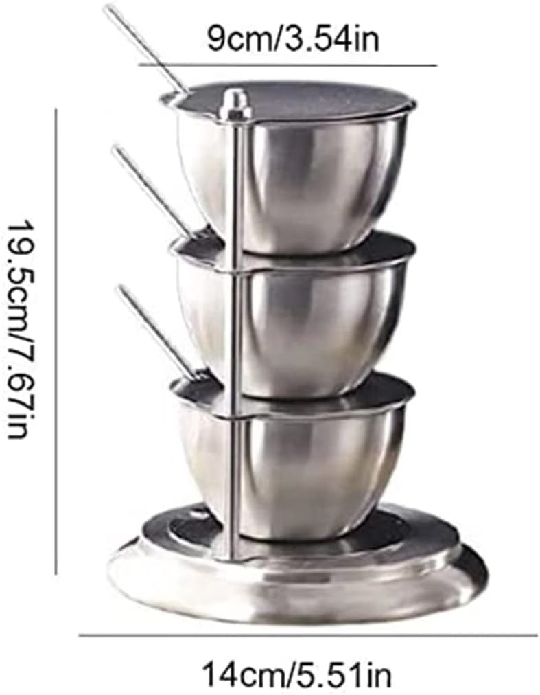 Product description: 1. No need to worry that salt or pepper will stain your kitchen counters and tables. 2. The well-designed kitchen utensils are comfortable to the touch, easy to use, as clear as glass materials, but not fragile. 3. Each spice jar has a dust cover to keep the interior clean 4. Suitable for storing various spices and powders, such as salt, pepper, sugar, ginger, garlic, etc. Specification: Product name: Rotating spice jar. Material: Stainless steel. Size: 14*19.5*9cm. Note: The size is manually measured, there may be slight errors, please refer to the actual product.