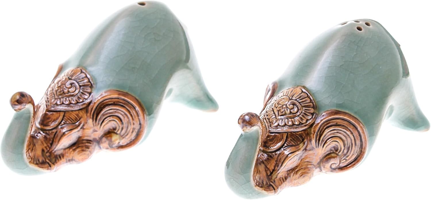 Novica works together with talented artists, artisans, and designers around the world to produce stunning, keepsake handmade treasures.About this item: Hunkered down in a crouched position, two cute elephants make a delightful addition to your kitchen. These creative salt and pepper shakers are handcrafted of ceramic, finished with brown and crackled green celadon glazes. Thai artisan Aunchalee Kaewduangtip creates this pair.Dishwasher safeFeatures a crackled finishFood safeHand-crafted item -- color, size and/or motif may vary slightlyAbout our Artist: Aunchalee Kaewduangtip says, 'I was born in Northern Thailand in 1976. When I was in junior high, I took a ceramics class because it looked like fun and I fell in love with the craft. After dropping out of the university due to family finances, I took a job with a celadon artisan where I learned many things. But I dreamed about crafting my own designs. After four years there, I bought a small gas-fired kiln, suitable for a family workshop, and began working on my own. I use both the potter's wheel and the slab technique in my work. I like to touch every piece of my work. I feel like I can pass my feelings onto my designs my happiness in each one of them. Although they are functional, they can be pieces of art.'
