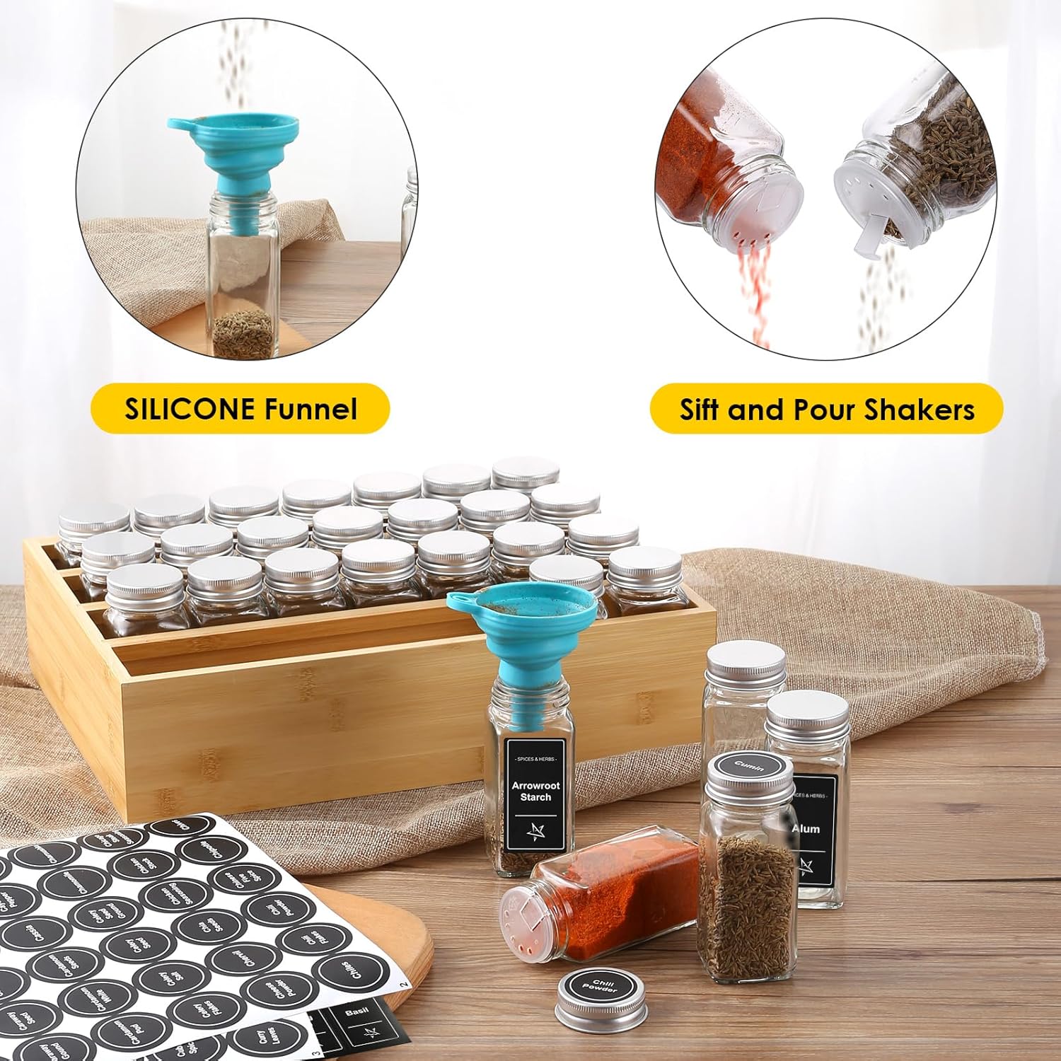 | Included Components | 1x 4-tier Spice Rack, 28 x Square Empty Glass Spice Jars, 28 x Shaker Lids, 1 x Collapsible Silicone Funnel, 1 x Chalk Marker, 396 Spice Labels(340 preprinted labels + 56 blank labels) |