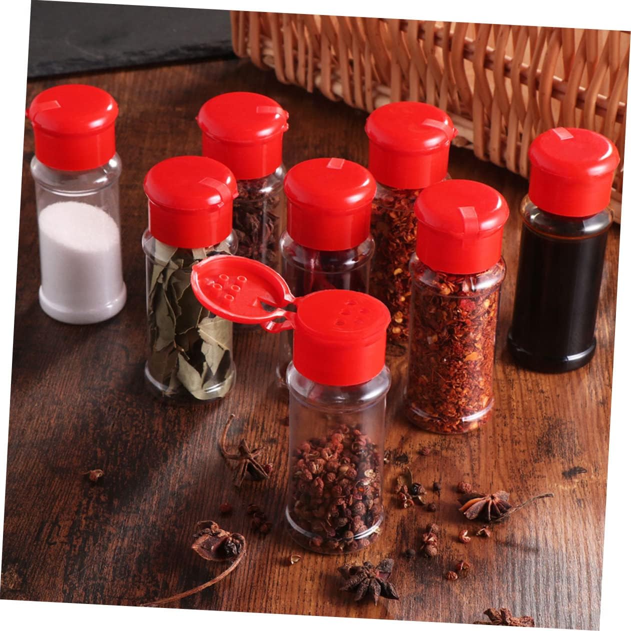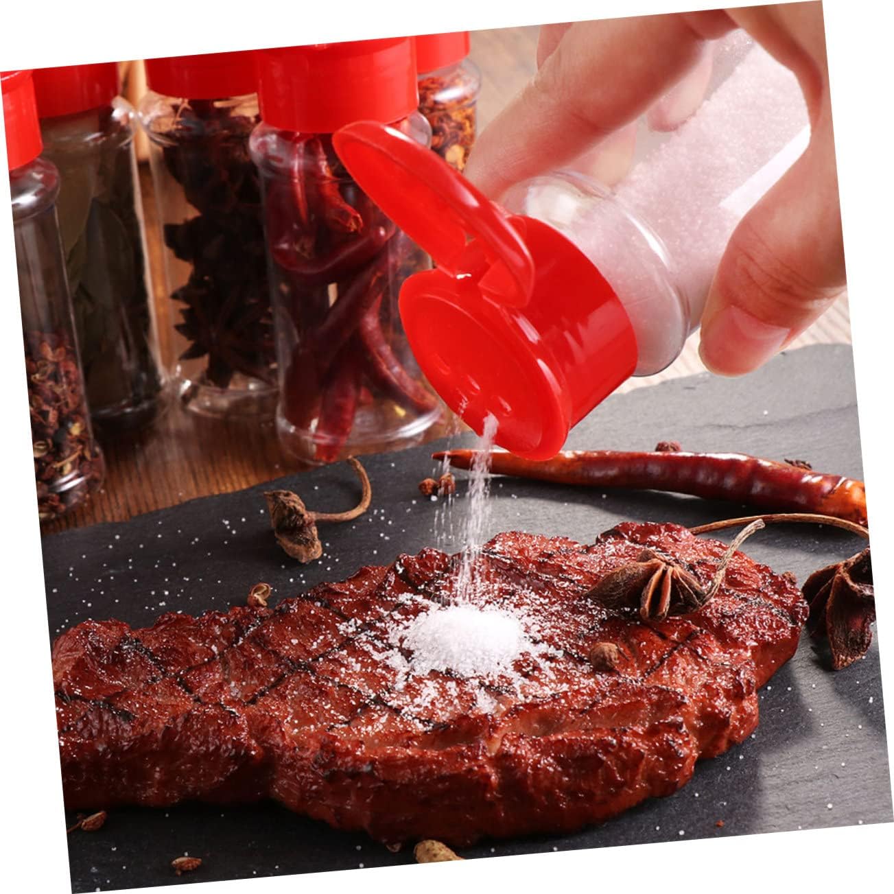 Package Include 30 x bottle Features - Color: Red plastic shaker bottles. - Size: 4 x 4 x 10.5cm bottles. - Material: PET clear plastic containers. - Removable lid for easy refilling is , health and safety clear plastic spices jars. - Space saving and easy to carry, for home use as well as outdoor BBQ grill bottles empty glass. - Features coarse perforations for cheese, pepper, sugar, cocoa powder and other coarse spices plastic salt shaker. - Made of plastic, it's and , safe for your health plastic jars with lids. - The lid can rotate closed, tight and reliable seal plastic seasoning jars.Goods Descriptionclear plastic container jars with lids The seasoning bottle is made from plastic, and its transparent body helps to identify inside content, avoiding the hassle of constantly removing the cap.empty spices bottles Classic, elegant design; for home kitchens and restaurant.powdered sugar shaker Stylish and practical set for your kitchen or dining table to season your food