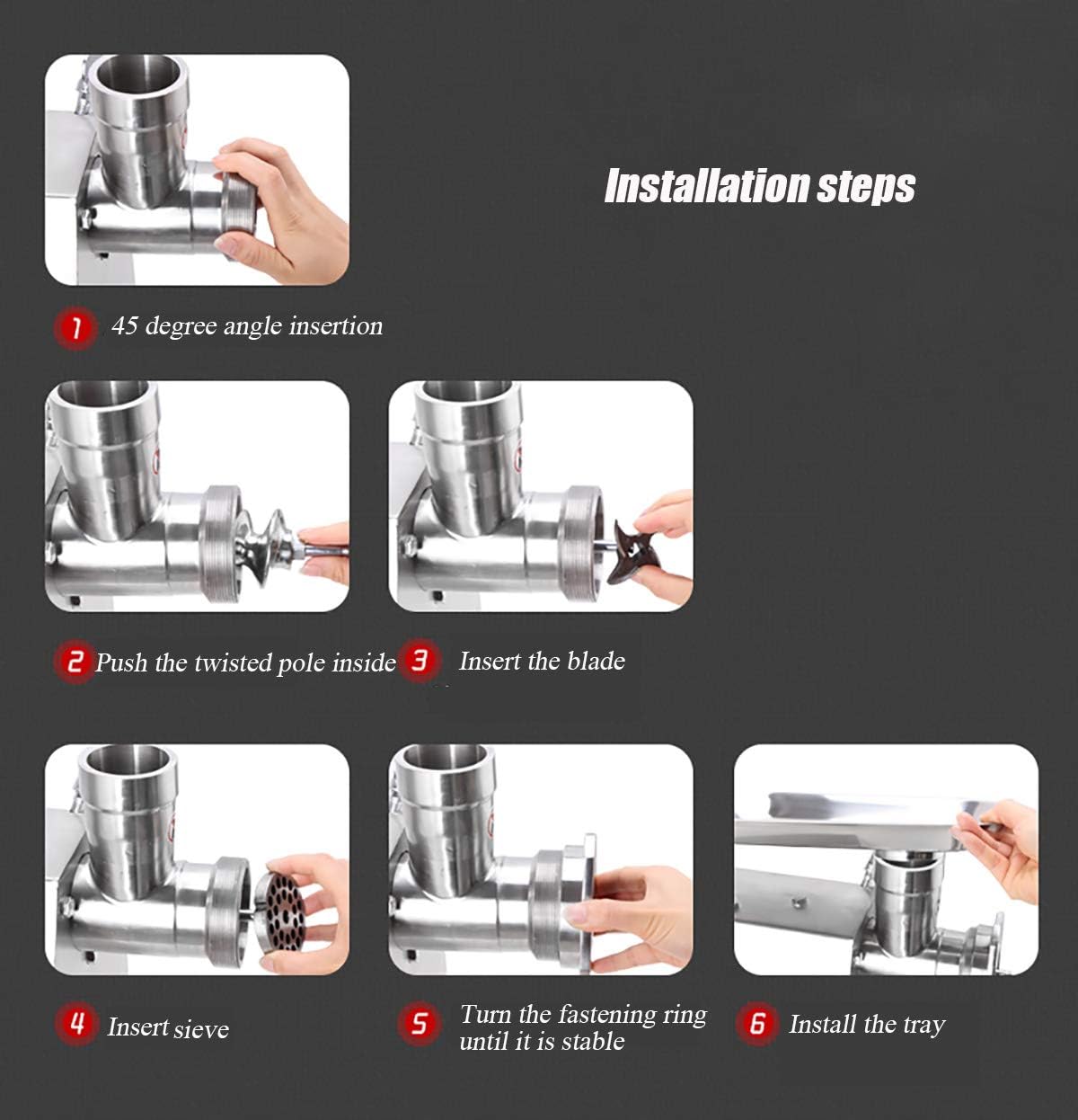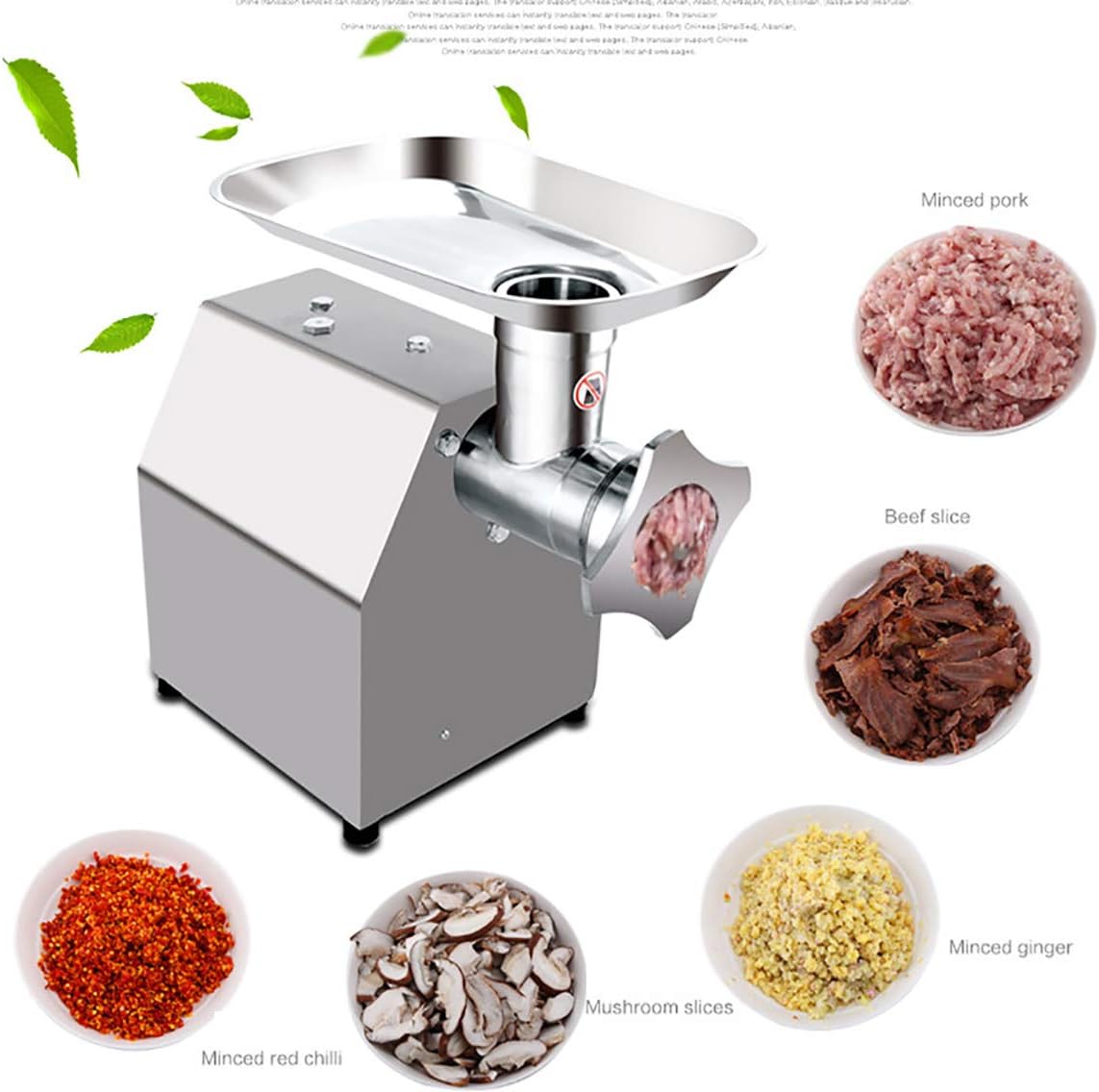 product parameters: Brand Name: Global Production capacity: 150kg/h Product model: 12 type precision cast steel Rated voltage: 110V (default) /220V/240V Cutter speed: 170/220/min Rated frequency: 50/60Hz Motor power: 800W Net weight gross weight 23kg/25kg Attention (1) Clean all parts that can be cleaned before using the electric meat grinder. (2) After assembling, turn on the power and add the meat after the standby device is operating normally. (3)Before ground meat, please cut the boning meat into small pieces (thin strips) to avoid damage to the machine. (4) Turn on the power, and add meat blocks after the operation is normal. (5) The meat must be added evenly, not too much, so as not to affect the damage of the motor. If the machine is found to be abnormal, the power should be cut off immediately, and the cause should be checked after shutdown. 6) If leakage, fire or other faults are found, the power supply should be cut off immediately and an electrician should be repaired. (7) Turn off the power after use. Then clean all the parts, drain the water, and put it in dry standby. (8) Before use, refer to the instruction manual.
