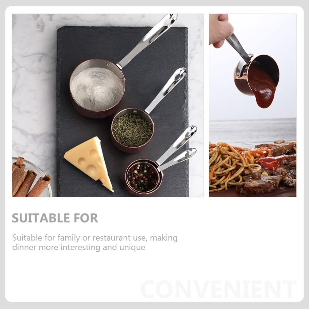 DAOUXIAOSPDescriptionStainless Steel Sauce Cups: Milk Baking Cup SaucepaHandle Small Measuring Cup Butter Coffee Soup for KitchenFeatures- Material: Stainless Steel- Note: 1/ 4 Cup- Size: 11.3X4.8CM.- Color: Rose Gold.Package Including1 x Sauce Cup