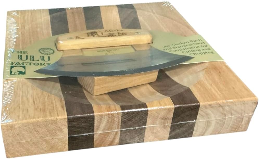 USA Made in Anchorage Alaska The Ulu Factory 6" Cutlery ulu knife comes with a matching Birch Stand and board ,USA Made Standard Size Ulu Mezzanine knife and board set The Ulu Factory - Made in Anchorage, Alaska USA 6" stainless steel Blade 8x8x1.5" Chopping bowl Alaska Design on Handle Comes with a matching Alaskan Birch Block Stand. Versatile kitchen tool perfect for filleting fish, cutting meats, cheeses, vegetables, and pizza. Blade is made with the highest quality of American stainless steel available. Single bevel precision ground and honed edge. Computer controlled heat treating. Polished to a mirror finish Handle is completed with several finishing operations and is pretreated with oil prior to packaging. Rinse with warm soapy water, pat dry, and store in a safe place.