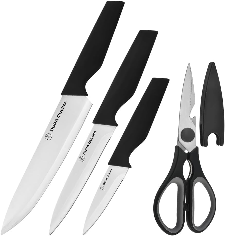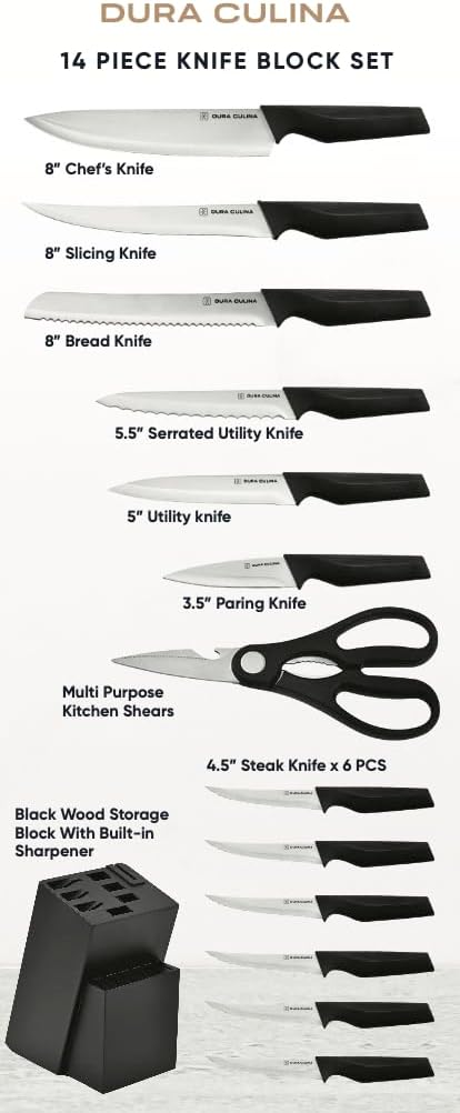 | Included Components | 8” Chef’s Knife, 8” Slicing Knife, 8” Bread Knife, 5.5” Serrated Utility Knife, 5” Utility Knife, 3.5” Paring Knife, 4.5” Steak Knives (6 pcs), Multi-Purpose Kitchen Shears, Black Wood Block with Built-In Sharpener |