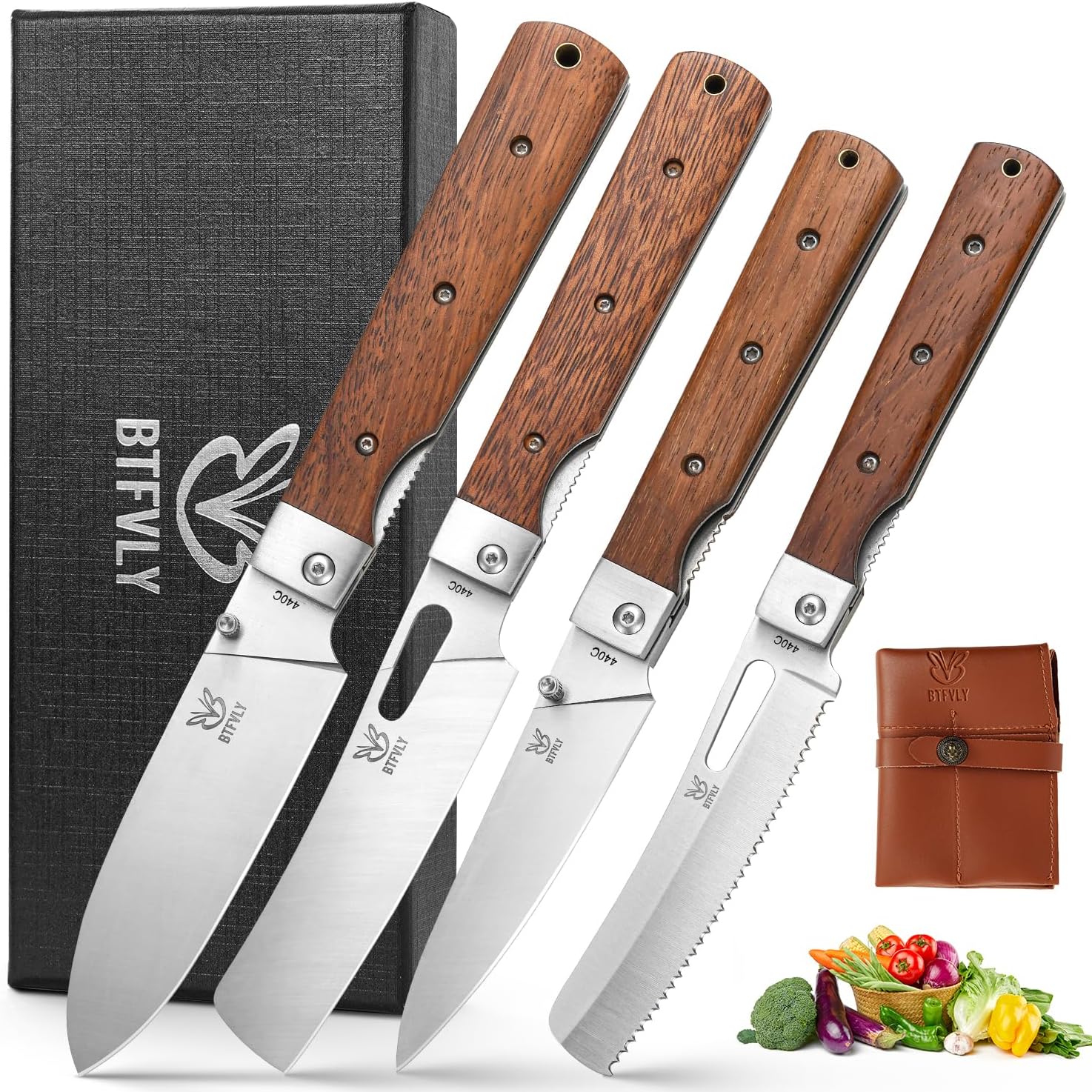 This 4 - piece folding knife set features 440A stainless steel blades, sharp for chef tasks, peeling, and bread cutting. With black - colored wood handles and a portable design, it’s ideal for kitchen and outdoor use—packaged as a gift - ready set.