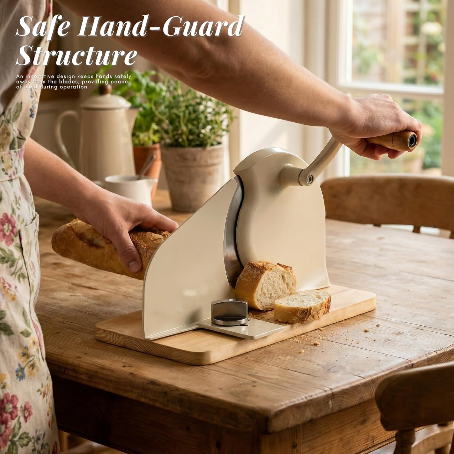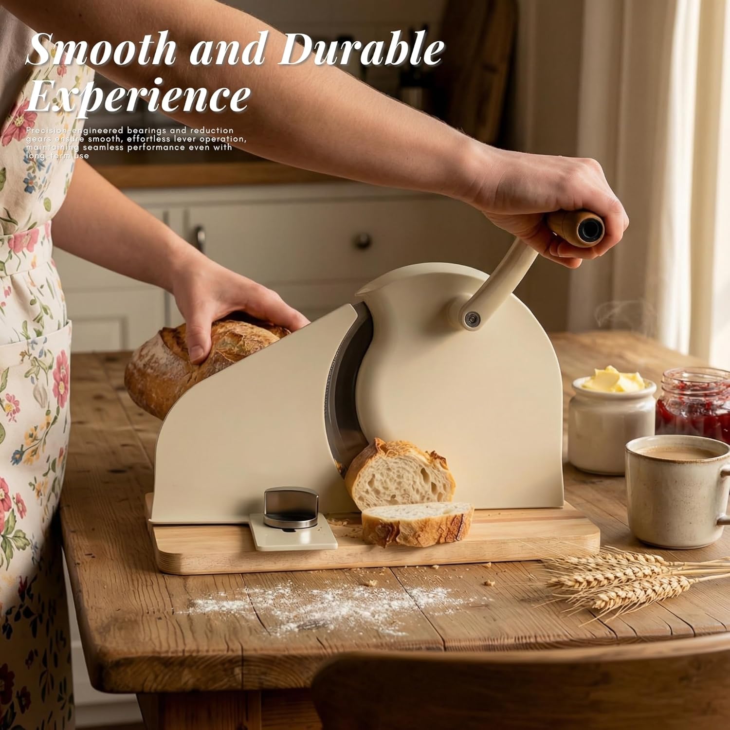 Manual Bread Slicer for Homemade Sourdough Bread, Hand Crank Bread Cutter with Adjustable Thickness, Scale Line, Slicing Guide, and Suction Cup, Sharp Stainless Steel Blade for Even Slices Adjustable Thickness: This manual bread slicer features a slicing thickness from 0" to 0.8", equipped with clear scale markings, ensuring perfect cuts for thick toast or thin bread slicesPremium Slicing Blade: The manual bread slicer is equipped with a food-grade stainless steel blade with sharp serrated edges, ensuring clean and precise cuts for crusty sourdough, soft sandwiches, and various other types of breadMetal Guide Rail: The metal guide rail prevents bread from falling, crushing, or getting stuck, ensuring smooth operationStable Operation: Hand crank bread slicer features a sturdy wooden base, with suction cups to secure the slicer firmly to the countertop, providing enhanced safety and stability without movement or slippageEasy to Use: Attach the bread cutter to your table, adjust to the desired thickness, and turn the ergonomic handle while gently pushing the bread through. After use, easily wipe off surface residue with a cloth or brushVersatile Applications: Hand crank bread slicer is compact and lightweight, perfect for creating even slices for commercial or homemade sourdough, bagels, croissants, rye bread, baguettes, and moreSpecificationsColor: Cream WhiteMaterial: Food-grade Stainless Steel, WoodSlicing Thickness: 0 - 0.8 inchesDimensions: 11.8 x 7.8 x 7.9 inchesPackage Content1 x Manual Bread Slicer