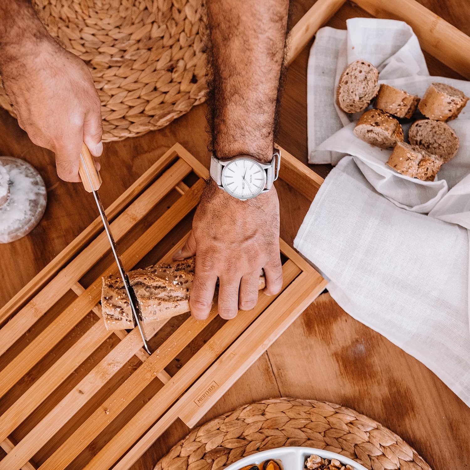 HIGH QUALITY: Robust bamboo wood provides great strength and durability, even with intense use. EASY TO CLEAN: When cutting the bread, the crumbs are stored in the crumb tray. INCLUDES KNIFE: Stainless steel knife and bamboo handle. Robust, elegant and matching the board. COMPACT: The knife is stored in its dedicated compartment, facilitating storage and ensuring it is always at hand. MEASUREMENTS: 40 x 23.5 x 4 cm
