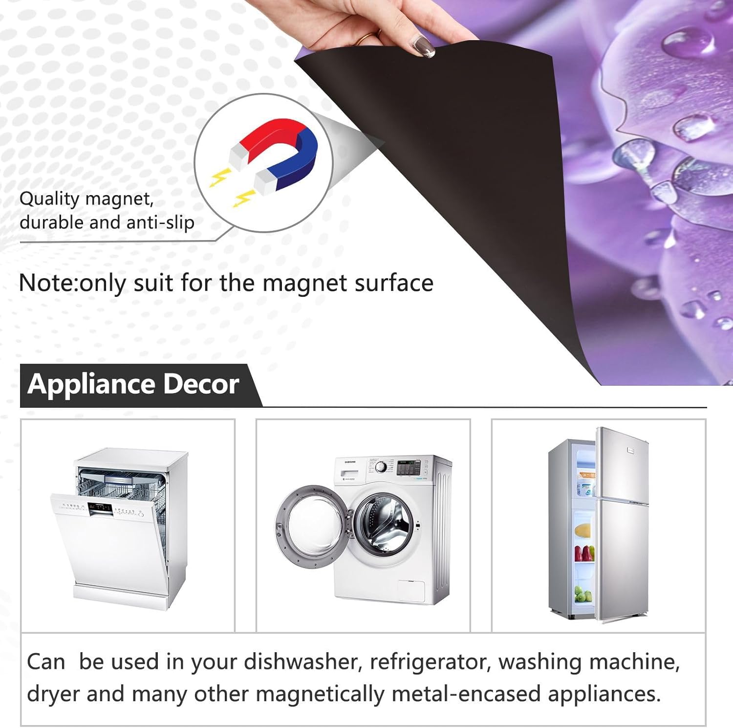 Decorate your kitchen life!This magnetic dishwasher cover is a work of art, decorating your kitchen art, with a sense of fashion and art, highlighting your quality life!Size in 23 x 26 inches. This size fits most dishwashers.Cut it to your own size to fits your need.FeatureWaterproof, heat resistant, scratch and tear resistant. Magnetic stickers hide scratches, dents or other unsightly marks.Magnetic MaterialMagnetic sticker will not fall from magnetic dishwasher and disassemble easily.Protect the dishwasher from scratches, it can also decorate your kitchen home.Please NoteMagnetic dishwasher cover is made of PVC+PET, only suit for the magnet surface.Install: Trim the proofreading position, the magnetic force on the back will stick to it.