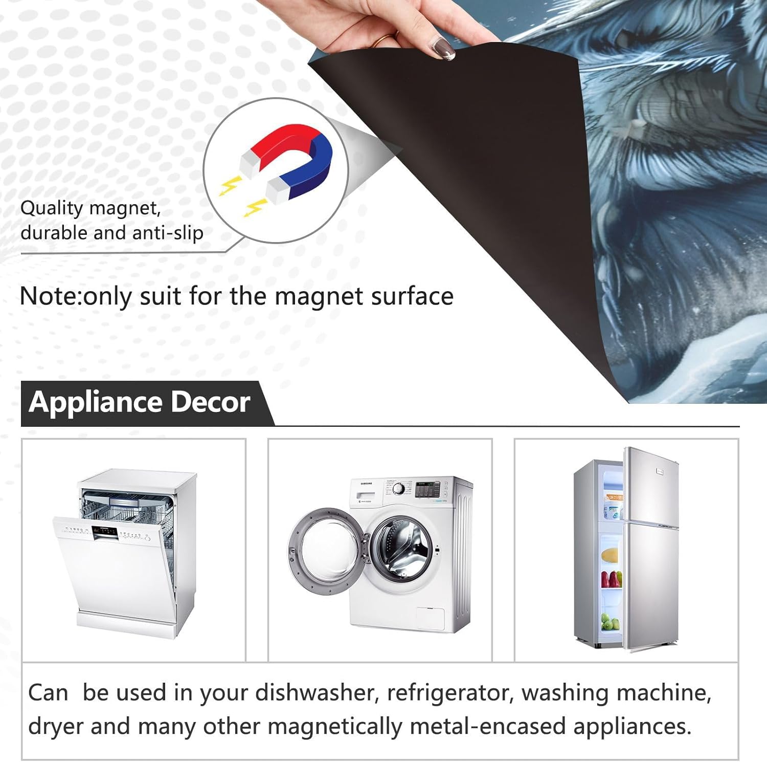 Decorate your kitchen life!This magnetic dishwasher cover is a work of art, decorating your kitchen art, with a sense of fashion and art, highlighting your quality life!Size in 23 x 26 inches. This size fits most dishwashers.Cut it to your own size to fits your need.FeatureWaterproof, heat resistant, scratch and tear resistant. Magnetic stickers hide scratches, dents or other unsightly marks.Magnetic MaterialMagnetic sticker will not fall from magnetic dishwasher and disassemble easily.Protect the dishwasher from scratches, it can also decorate your kitchen home.Please NoteMagnetic dishwasher cover is made of PVC+PET, only suit for the magnet surface.Install: Trim the proofreading position, the magnetic force on the back will stick to it.