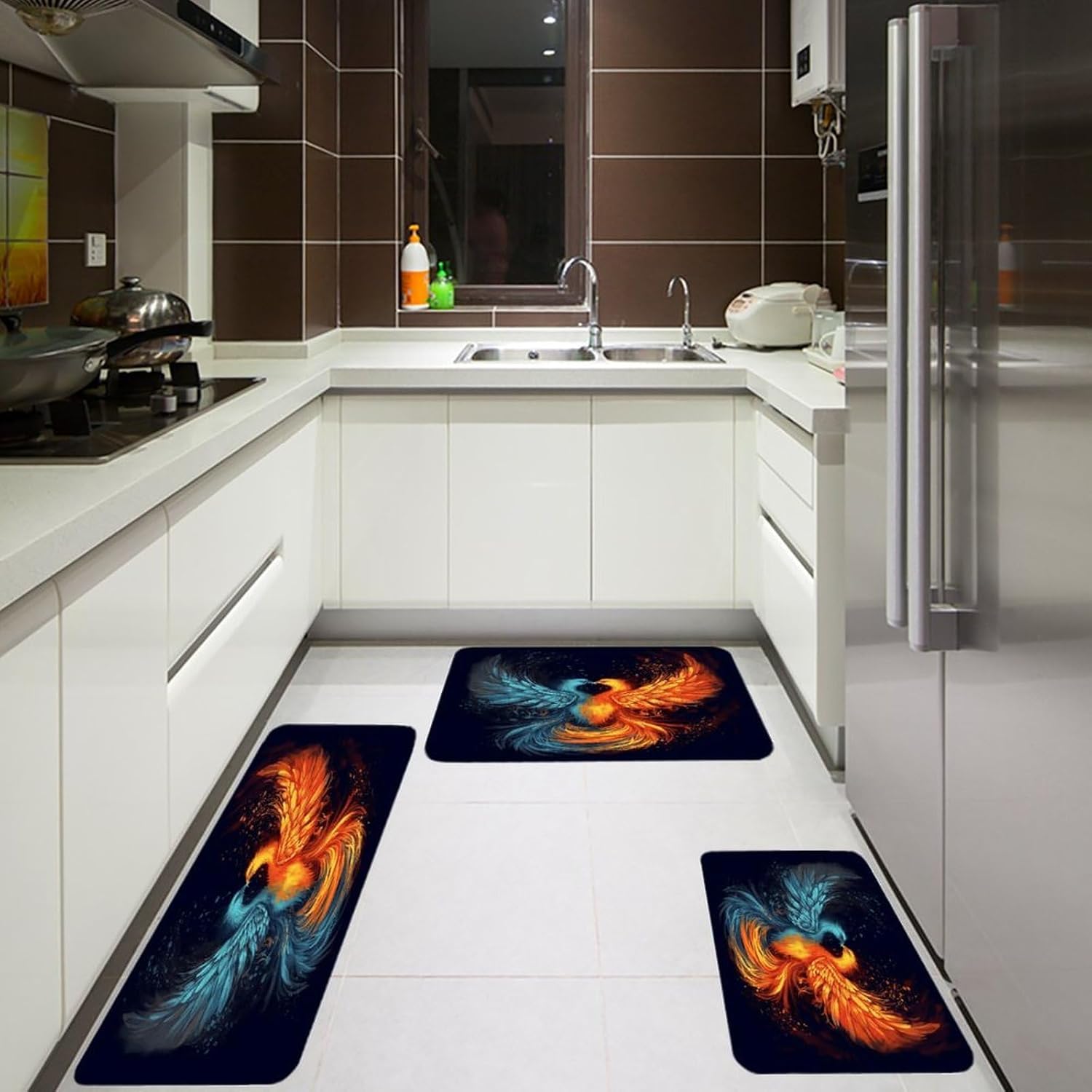 Transform your living spaces with this essential Fire And Water Phoenix three-piece set of mats,designed to merge everyday function with effortless style.These washable kitchen mats,crafted from a distinctive Fiber Flannel,introduce a layer of plush softness that welcomes you from the first step.Imagine the comfort of natural,thickened fibers underfoot as you move through your daily routines,whether you're preparing a meal or freshening up.The set's versatile design allows it to adapt beautifully,serving equally well as farmhouse bathroom rugs or soft entryway runner rugs,proving that comfort should have no single address.Beyond their immediate comfort,these mats are conceived for real-life ease and adaptability.As dedicated anti fatigue Fire And Water Phoenix kitchen mats for floor areas,they provide a forgiving surface during prolonged tasks.Need a reliable carpet for sink areas to catch drips and spills?This set has you covered.You can freely place them in moisture areas or traffic zones,knowing their performance remains consistent.These are more than mere kitchen utensils;they are subtle yet impactful seasonal home Fire And Water Phoenix decor mats.Change the feel of your space by rotating them or moving them from a spring kitchen carpets setup to a cozy autumn nook.Their cohesive look ties different areas together,enhancing the overall beauty and warmth of your interior.Their breathable and gentle texture makes them a reliable companion in any room,offering a consistently pleasant foundation.