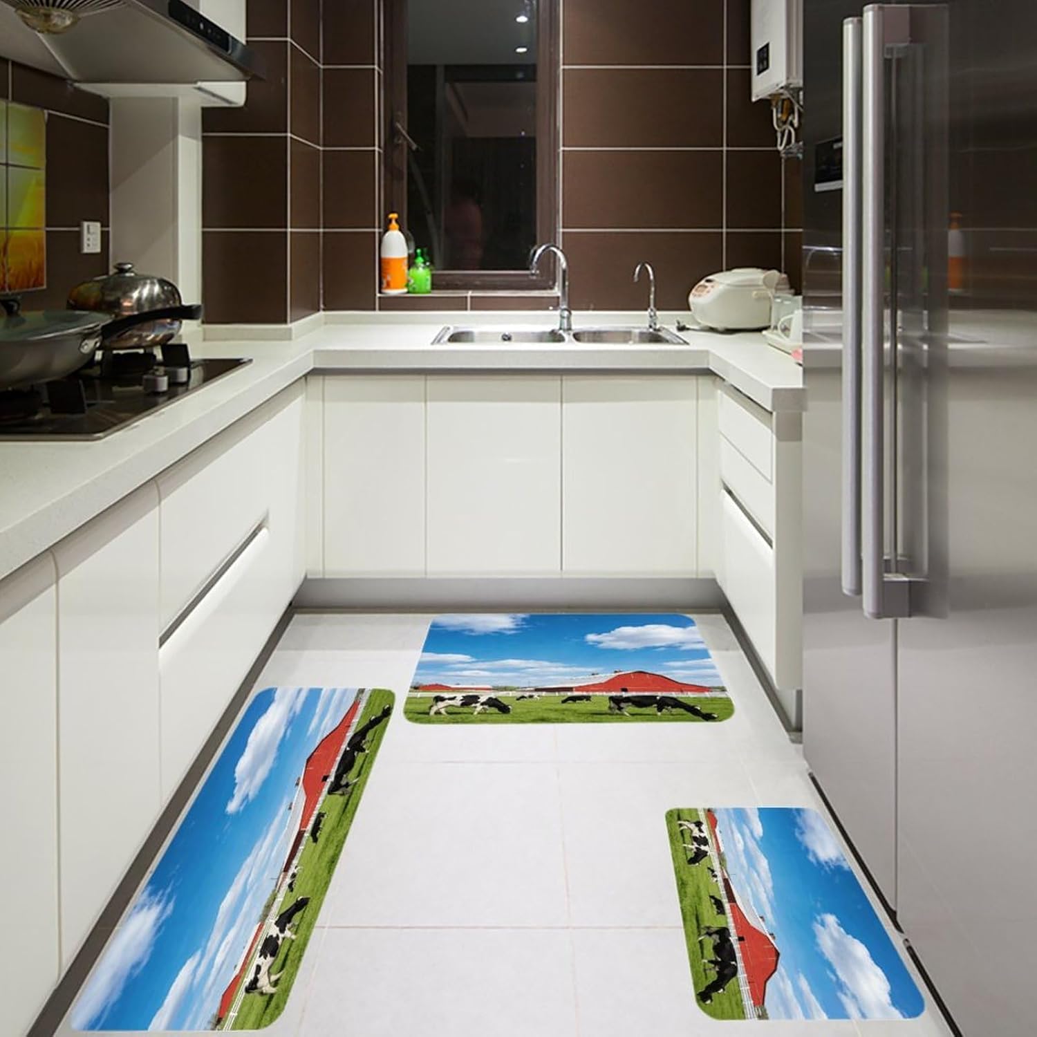 Transform your living spaces with this essential Animal Farm three-piece set of mats,designed to merge everyday function with effortless style.These washable kitchen mats,crafted from a distinctive Fiber Flannel,introduce a layer of plush softness that welcomes you from the first step.Imagine the comfort of natural,thickened fibers underfoot as you move through your daily routines,whether you're preparing a meal or freshening up.The set's versatile design allows it to adapt beautifully,serving equally well as farmhouse bathroom rugs or soft entryway runner rugs,proving that comfort should have no single address.Beyond their immediate comfort,these mats are conceived for real-life ease and adaptability.As dedicated anti fatigue Animal Farm kitchen mats for floor areas,they provide a forgiving surface during prolonged tasks.Need a reliable carpet for sink areas to catch drips and spills?This set has you covered.You can freely place them in moisture areas or traffic zones,knowing their performance remains consistent.These are more than mere kitchen utensils;they are subtle yet impactful seasonal home Animal Farm decor mats.Change the feel of your space by rotating them or moving them from a spring kitchen carpets setup to a cozy autumn nook.Their cohesive look ties different areas together,enhancing the overall beauty and warmth of your interior.Their breathable and gentle texture makes them a reliable companion in any room,offering a consistently pleasant foundation.