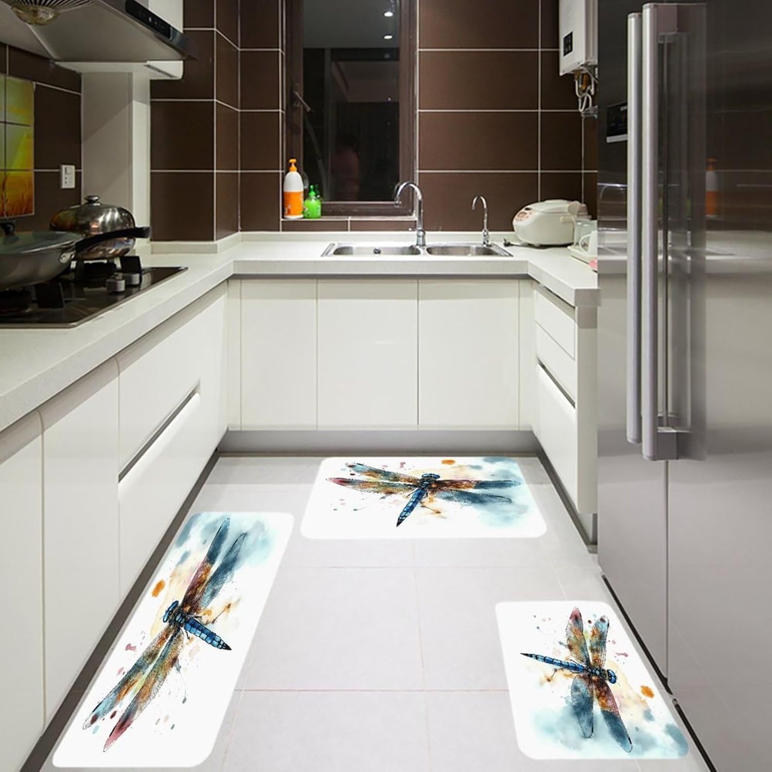 Introduce a new level of ease and visual harmony to your culinary space with this essential three-piece Watercolour Dragonfly kitchen mat set.Designed specifically for use areas,these cushioned kitchen rugs provide a welcome layer of support right where you need it most–in front of the sink,stove,or prep counter.the fabric offers a plush,dense texture underfoot,making standing tasks noticeably more comfortable.The set functions perfectly as versatile kitchen area rug solutions,fitting seamlessly into your existing layout.The core of these anti fatigue Watercolour Dragonfly kitchen rug sets lies in the selected velvet material.This fabric choice delivers both the sought-after softness and a practical thickness that gently cushions your feet,helping to alleviate the tiredness that comes with long cooking sessions.Beyond comfort,maintenance is refreshingly simple;they are washable kitchen mats designed to maintain their appearance through regular cleaning.Extend the utility and aesthetic charm beyond just the kitchen.The soft Watercolour Dragonfly kitchen runner rugs design and quality construction make them adaptable companions for other areas like the bathroom vanity or even outdoor patio setups where a comfortable floor mat is desired.Arrange the three pieces to create a cohesive runner effect or use them individually as targeted floor mats where support is needed.This set effectively combines practical comfort,effortless care with its washable nature,and an attractive upgrade to your floor space,making it a smart addition to any home.