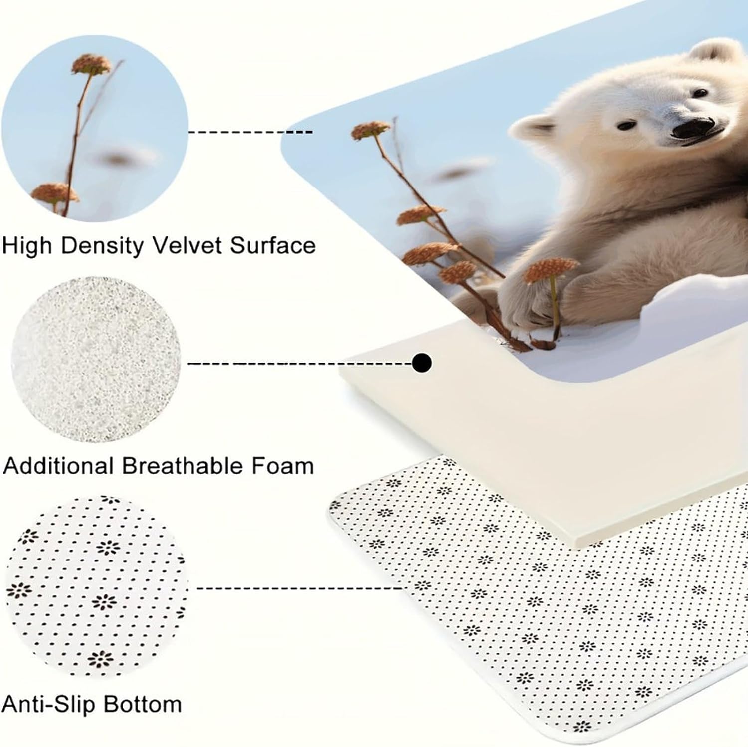 Introduce a new level of ease and visual harmony to your culinary space with this essential three-piece Cute Polar Bear Animals kitchen mat set.Designed specifically for use areas,these cushioned kitchen rugs provide a welcome layer of support right where you need it most–in front of the sink,stove,or prep counter.the fabric offers a plush,dense texture underfoot,making standing tasks noticeably more comfortable.The set functions perfectly as versatile kitchen area rug solutions,fitting seamlessly into your existing layout.The core of these anti fatigue Cute Polar Bear Animals kitchen rug sets lies in the selected velvet material.This fabric choice delivers both the sought-after softness and a practical thickness that gently cushions your feet,helping to alleviate the tiredness that comes with long cooking sessions.Beyond comfort,maintenance is refreshingly simple;they are washable kitchen mats designed to maintain their appearance through regular cleaning.Extend the utility and aesthetic charm beyond just the kitchen.The soft Cute Polar Bear Animals kitchen runner rugs design and quality construction make them adaptable companions for other areas like the bathroom vanity or even outdoor patio setups where a comfortable floor mat is desired.Arrange the three pieces to create a cohesive runner effect or use them individually as targeted floor mats where support is needed.This set effectively combines practical comfort,effortless care with its washable nature,and an attractive upgrade to your floor space,making it a smart addition to any home.
