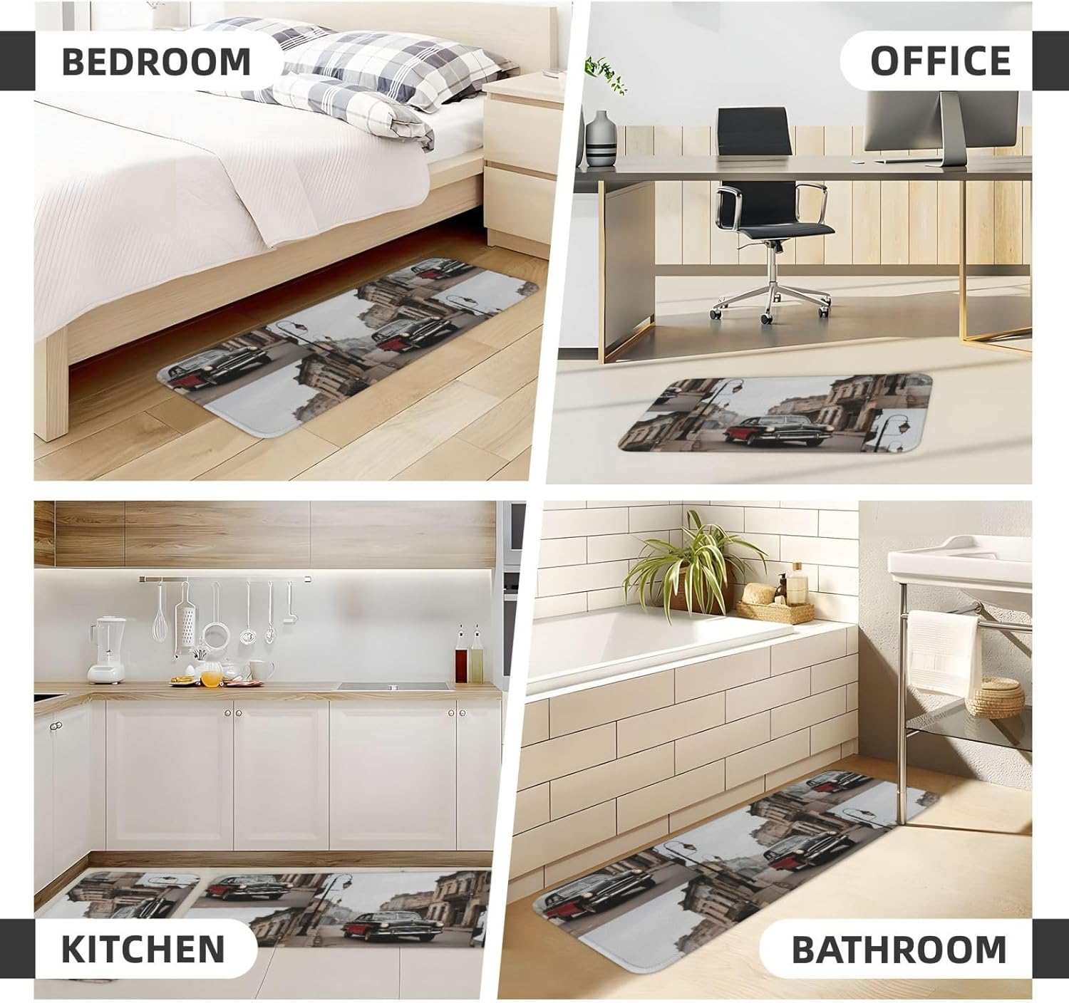 Kitchen Rugs and Mats, Anti Fatigue Comfort Standing Kitchen Runner Mat Vintage Car Kitchen Floor Mat 2 Sets Boho Kitchen Rug for Kitchen Decor Floor Mat Runner Carpet for Hallways Farmhouse Kitchen Mat, Cushioned Anti Fatigue Kitchen Mats for Floor, Non Slip Rugs for Kitchen Floor, Vintage Car Kitchen Mat Anti Fatigue Cushioned, Memory Foam Padded Standing Rug Washable, Non Slip Comfort Floor Runner for Home, Sink, Laundry, Office Cushioned Kitchen Mats for FloorSize: The set contains 2 rectangular mats (17.3"*29.5"+17.3"*47.2").Durable and non-slip: It's made of PVC material, the grain backing prevent slipping or shifting.Decent design: The simplicity pattern and color make your kitchen more stylish.Multi-purpose: Suitable for laundry, doorway, outdoor, kitchen, foyer, bathroom, etc.Easy to clean: Waterproof material make this anti fatigue mat easy to clean, just wipe it with wet cloth.Stylist Multi-functional Floral Anti Fatigue Kitchen Mats Set: These 2-piece farmhouse kitchen rug set includes a kitchen runner + rectangle kitchen carpet, fitting most kitchen spaces, also suitable as standing desk mat, laundry room rug and runner,office mat,doormat, bedroom rug ,bathroom rug mat, bedroom accent or other anti fatigue mat application, provides a warm accent for the home or kitchen.Also be great gift idea for Thanksgiving,Christmas or any other holiday!